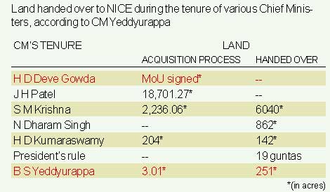 <p><br />NICE reply<br /><br />1. False. As per the article 5.1.2 of Frame Work Agreement (FWA), Govt shall sell land to the promoter.<br /><br />2. As per FWA, 5,688 acre of Govt land needs to be handed over by KIADB for 40 years lease at the lease rent of Rs 10/acre/year. <br /><br />But the lease rent is only temporary, as the company will pay mutually agreed price (as per 1999-2000 guidance value).<br /><br />3. False. Only 6,999 acre for road and 12,194 acres for township is required as per FWA. It is High Level ommittee headed by the CS which gives land for stage 1. The issue is settled long ago.<br /><br />4. ODP is the master plan for BMICPA. The AG’s submission before SC is based on facts.<br /><br />5. Submitted maps & drawings long ago. PWD approved plots for the alignment on July 20 2002; incorporated in ODP on Feb, 12 2004; has been upheld by Supreme Court.<br /><br />6. No meaning in it. NICE has struggled for 12 years to implement the project. <br /><br />Gowda’s allegation</p>.<p>1. Govt land is being illegally sold to NICE<br />2. Govt has leased out land at Rs 10 per acre per year<br />3. NICE is getting excess land of nearly 4,955 acre around B’lore<br />4. Advocate General misled the SC on road alignment<br />5. NICE has not submitted any drawings on alignment to Govt so far<br />6. NICE has no intention to implement the project<br /><br />Status <br /><br />* 40.5 kms of 41 kms of peripheral road done<br /><br />* 8.1 km of 9.1 link road completed<br /><br />* 6 kms of 111 expressway done.<br /><br />* Govt has handed over around 7,000 acre land<br /><br />Project highlights</p>.<p>* Express way between B’lore and Mysore — 111 kms<br /><br />* Peripheral road — 41 kms<br /><br />* Link road — 9.1 kms<br /><br />* Five townships<br /><br />* Total land required — 20,193 acre<br /><br />* Project promoter NICE<br /><br />* Project MoU signed in 1995<br /><br /></p>.<p><br />H D Deve Gowda<br /><br />“Successive governments from 2003 have issued absolute sale deed to the NICE for over 1,040 acre of prime land around Bangalore, against the original frame work agreement of BMIC project. The land should be given only on lease for 30 years and the promoter should hand over the entire land meant for road component back to the Government.”<br /><br />B S Yeddyurappa<br /><br />“Deve Gowda is trying to mislead farmers and vitiate law and order situation in the State sing the BMIC project as an excuse. <br /><br />What is his intention? <br /><br />Why is he losing his cool? <br /><br />Why is he creating confusion and hampering development?”<br /><br /></p>