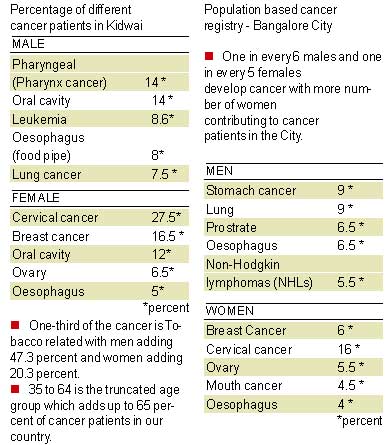 <p>With WHO’s theme this year being ‘Cancer can be prevented too’, on the occasion of World Cancer Day Deccan Herald looks at the present status, affordability and obstacles in the path of cancer care in Karnataka.<br /><br />According City’s Kidwai Memorial Institute of Oncology, over 50,000 new cases are being diagnosed as per population based records. In Kidwai Hospital alone over 16,600 fresh cases of cancer were diagnosed in 2009. <br /><br />However, in terms of types of cancer, tobacco-related cancer (47.3 per cent) dominated among men, followed stomach and prostrate cancer. In women, there is a growing number of breast cancer cases among the urban women, while women from rural areas seem to be showing signs of cervical cancer with mainly human papillomavirus (HPV) infection being reported.<br /><br />Dr M Vijay Kumar, Director-in charge at Kidwai, said, "Due to lifestyle changes, cases of breast cancer are more among urban women. However, cervical cancer case is more among women from rural areas due to unhygienic conditions."<br /><br />Although the real reason for higher incidences of breast cancer are still unknown, family history seems to be playing a huge role. <br /><br />"There are speculations about oral contraceptives but that again hasn’t been proved. It is better for women to undergo diagnosis after 30, since Indians develop cancer 10 years earlier than the standard age group internationally," said Dr Vijaykumar. However, he added that ovarian cancer and breast cancer are related and studies have shown that usage of hormone replacement therapy increases the risk of breast cancer.<br /><br />Despite having advanced technology in cancer treatment with regards to refinement in Linear accelerators and more effective and less side-effective radiotherapy, what is more concerning is the affordability of cancer treatment, especially for the below poverty line (BPL) families. <br /><br />Scheme a boon to poor<br /><br />At Kidwai, despite having State government grants, philanthropists’ help and providing drugs at subsidised rates, the load of patients is so high that all sources of mobilising funds always falls short. He said that the recently launched 'Survarna Arogya Suraksha' scheme where State government provides tertiary care to BPL families will be a boon for cancer treatment. <br /><br />Statistics<br /><br /></p>