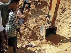 <p>The deceased Ramanji (36) of Gowdasandra, Muddurappa (40) of Kallinayakanahalli were loading the sand into the truck when the incident happened.<br /><br />Shakuntala Bhai had given her land on contract to Srinivasbabu for several years.<br />Everyday, Srinivasbabu employed 40 labourers to load sand into the trucks from the land. On Monday morning at around 6:30 am when illegal sand mining was being carried out at 60-feet deep in the land, the earth caved in killing two labourers on the spot. <br /><br />The other labourers are reported to have fled the scene of accident. On hearing about the incident an excavator was immediately pressed to work and the bodies of two labourers were retrieved.<br /><br />Deputy Commissioner Anwar Pasha, tahsildhar Dr Sudha, Circle Inspector Srinivasmurthy and others visited the site of accident.</p>
