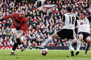 <p>United officials buried a time capsule near the tunnel before Sunday's kickoff to mark 100 years at Old Trafford and Rooney etched his name ever deeper into the club's fabric with another unstoppable display. <br /><br />At this rate the England striker could well surpass the 42 goals scored by Cristiano Ronaldo in the 2007-8 season. On a day when United laboured to answer the victories for Chelsea and Arsenal that had dropped them down to third, Rooney provided the spark with a display that illustrated why England's World Cup hopes rest so heavily on his shoulders. <br /><br />His instinctive first goal, 30 seconds into the second half punctured Fulham's resistance and his second with six minutes remaining settled some jitters against a dogged London side for whom Bobby Zamora fluffed two great chances. <br /><br />To cap his afternoon Rooney's raking diagonal pass then instigated a move that ended with Dimitar Berbatov adding a third goal in the final minute as United, bidding for a fourth consecutive title, moved to 66 points with eight games remaining, two points ahead of Chelsea and Arsenal. <br /><br />Chelsea and Arsenal are locked together on 64 points although the former have a better goal difference and a game in hand. Surprisingly Rooney hardly got a kick during the opening 20 minutes as Fulham stifled the home side although he did burst into life with a snap shot that was well saved by Mark Schwarzer. <br /><br />Zamora wasted another chance when he delayed too long when clean through, allowing Vidic to make a block and shortly afterwards Rooney sealed the points with a sweeping right-foot finish after great wing play by Berbatov. Berbatov then headed in a Park-Ji sung cross to reach double figures for the season. <br /><br />Didier Drogba scored twice to lift Chelsea to a 4-1 victory over West Ham United on Saturday while Arsenal shadowed them with a last-gasp victory at Hull City. <br />Drogba's double and one for Malouda killed off relegation-threatened West Ham who were level at halftime after former Chelsea man Scott Parker cancelled out Alex's header. <br />Nicklas Bendtner, fresh from a Champions League hat-trick against Porto in midweek, punished Hull keeper Boaz Myhill's mistake in the third minute of stoppage time to earn Arsenal a 2-1 victory at 10-man Hull. <br /><br />Below the title scrap, Roman Pavlyuchenko boosted fourth-placed Tottenham Hotspur's push for Champions League qualification with two goals in a 3-1 home defeat of Blackburn Rovers. Aston Villa, one of Tottenham's rivals for fourth spot, lost ground with a 0-0 draw at Stoke City. <br /></p>