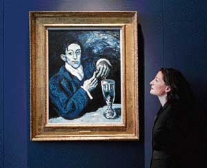 <p>‘Portrait of Angel Fernandez de Soto (The Absinthe Drinker)’, dated 1903, is expected to fetch 30-40 million pounds ($45-60 million), the highest pre-sale estimate for any work of art offered at auction in Europe. <br /><br />The June-23 auction follows a February sale at rival Sotheby’s where a Giacometti sculpture went under the hammer for $104.3 million, just beating the previous record for another Picasso that sold for $104.2 million in New York in 2004. <br /><br />Wednesday’s announcement of the June sale underlines growing confidence in the art market after a sharp contraction during the financial crisis. <br /><br />The Picasso, featuring a seated man with a glass of absinthe and a pipe, the smoke curling upwards, is being offered by composer Andrew Lloyd Webber, and the proceeds will go to his foundation which promotes arts and culture in Britain. <br /><br />The same work was originally offered for auction at Christie’s in November 2006, but it was withdrawn at the 11th hour after an individual challenged its true ownership and said it was effectively stolen from his family by the Nazis. <br /><br />“This challenge has since been resolved by agreement and the claimants have withdrawn all claims to the painting, leaving the foundation free to sell the work,” Christie’s said in a statement. <br /><br />‘Huge’ interest<br /><br />Jussi Pylkkanen, president of Christie’s Europe, Russia and the Middle East, said the painting could end up in a major museum or private collection, and anticipated that interest from collectors would be “huge”. <br /><br />“This is one of the most important works of art to be offered at auction in decades,” he said. Christie’s called it “the very embodiment of Blue Period aesthetic, rendered in bold, loose, swirling brush strokes that recall El Greco and trumpet Picasso’s virtuosity.” <br /><br />Picasso met Angel, the subject, in 1899 and they twice shared studios in Barcelona. <br /></p>