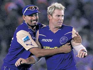 <p>Chasing 184 to win, Kings XI suffered a spectacular collapse losing their last eight wickets for a paltry 45 runs as Rajasthan went up to joint fourth place with four points from five outings in the Indian Premier League III. Punjab could muster only 152 before getting bundled out with five balls to spare. <br /><br />This was Royals’ second straight win after suffering three consecutive losses. For the tottering Kings XI, the defeat came as a huge blow and they were now pushed to the bottom of the chart with two points from five matches. <br /><br />At one point, the Punjab team was galloping towards victory with the scorecard reading 107 for two in the 11th over; a run-rate of nearly 10 an over. However, the loss of Yuvraj Singh triggered a collapse as the late order batsmen failed to capitalize on the good start provided by Ravi Bopara, skipper Kumar Sangakkara and Manvinder Bisla.<br /><br />Sangakkara and Bopara gave a flying start to the hosts’ chase as they raced to 41 in four overs. The Sri Lankan left-hander struck six boundaries to score 29 off just 13 balls. Bisla sustained the momentum with lusty blows as he struck a quick-fire 35 off only 18 balls studded with two sixes and four fours and during that phase victory seemed so near to the Punjab outfit. <br /><br />Fine rally<br /><br />However, Royals came back into the match after the initial pounding. Pacer Siddharth Trivedi led Rajasthan’s revival in the middle overs with a fine effort (2-25) and Yusuf Pathan (2-9) too chipped in with a handy contribution. Australian paceman Shaun Tait, after a wayward beginning, came back strongly to take three wickets to stop Kings XI on their tracks. <br /><br />Earlier, Sangakkara won the toss and put Royals into bat. England import Michael Lumb provided initial spark to Royals’ innings as they raced to 50 in just 5.1 overs. Lumb struck a fine 30-ball 41 which included seven hits to the fence before being stumped by Sangakkara off leg-spinner Piyush Chawla. Yusuf (28 off 19 balls) kept up the pace with some meaty blows. Later, Faiz Faizal (45) and Adam Voges stitched together a 60-run partnership in 37 balls to propel the team score to 183 in 20 overs.<br /><br />Voges remained unbeaten on 45 which came off only 24 balls and included a six and five boundaries. <br /><br />Score Board</p>.<p>RAJASTHAN ROYALS: Michael Lumb st Sangakkara b Chawla 41; Naman Ojha c Srivastava b Sreesanth 13; Faiz Fazal (run out) 45; Yusuf Pathan c Yuvraj b Srivastava 28; Adam Voges (not out) 45; Paras Dogra (run out) 1; Abhishek Jhunjhunwala (not out) 0; Extras (LB-3, W-5, NB-2) 10; Total (5 wkts. 20 overs) 183<br />Fall of wickets: 1-35, 2-60, 3-111, 4-171, 5-179.<br />Bowling: Irfan Pathan 4-0-45-0; Sreesanth 3-0-20-1; Shalabh Srivastava 4-0-49-1; Juan Theron 4-0-25-0; Piyush Chawla 4-0-29-1; Yuvraj 1-0-12-0. <br /><br />KINGS XI PUNJAB: Ravi Bopara c Trivedi b Patel 25; Kumar Sangakkara c Fazal b Tait 29; Manvinder Bisla c Lumb b Warne 35; Yuvraj Singh c Fazal b Trivedi 15; Mahela Jayawardene c Jhunjhunwala b Trivedi 23; Irfan Pathan (run out) 1 1; Mohammad Kaif lbw Pathan 8; Piyush Chawla c Tait b Pathan 8; Juan Theron c Patel b Tait 2; S Sreesanth (not out) 0; Shalabh Srivastava b Tait 0; Extras (LB-2, W-3, NB-1) 6; Total (all out; 19.1 overs) 152 <br /><br />Fall of wickets: 1-41, 2-85, 3-107, 4-113, 5-115, 6-126, 7-136, 8-140, 9-152. <br />Bowling: Munaf Patel 4-0-43-1, Shaun Tait 3.1-0-22-3, Shane Warne 4-0-39-1, Siddharth Trivedi 4-0-25-2, Voges 2-0-12-0, Pathan 2-0-9-2. </p>