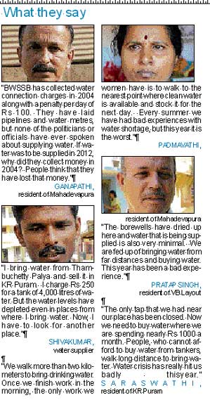 <p>‘Parched’ would be an understatement at Veerabrahma Layout in KR Puram. For, this residential area housing 25,000 Bangaloreans, receives water only thrice a month! <br /><br />But this is just one shocker from KR Puram, now reeling under an acute water crisis that has left every resident there affected in some way. Here’s one deep look at the problem in the area, a spot inspection that surely echoes what many Bangaloreans are experiencing elsewhere. <br /><br />It is a daily battle out there. Ask any KR Puram resident about their biggest worry and hear them shout “Water!” Clean drinking water seems like a distant dream, because even after shelling out more than Rs. 1,000 every month for tankers and local borewell water suppliers, they aren’t getting enough. In Veerabrahma (VB) Layout with 3,800 houses, only 30 pots of water can be filled thrice a month. The residents have to wait in long queue at the spot where the water is supplied by tankers.<br /><br />"Never before have we suffered so much for water here. People have been spending a lot on buying water. There is no question of conserving water as the supply is too less," said Pratap Singh, resident of VB Layout.<br /><br />KR Puram residents had paid for Cauvery water connection in 2004 along with interest. Households had to pay Bangalore Water Supply and Sewerage Board (BWSSB) Rs. 14,000 including meter charges, plus interest at the rate of Rs. 100 per day. But till date, not a droplet has been supplied. <br /><br />"Irrespective of the government, only assurances are given. Nobody actually keeps up any of their promises,” lamented Venugopal Shetty, a resident.<br /><br />Long distances <br /><br />Women carrying plastic pots is a common sight here. Residents who cannot afford to pay the water suppliers walk nearly two km bring drinking water. "Earlier, I used to walk long distances to bring water, but of late due to my health problems, I have started buying water. The problem has really gone from bad to worse," said Saraswathi, a long-suffering resident.<br /><br />The situation is no different in areas under Mahadevapura. Rama, a resident of Saraswathinagar, complained how her health had deteriorated carrying water pots, day in and day out. "It has been more than six months since the CMC water supply has dried out. Women in every house walk long distances to bring drinking water and many have even suffered health problems.”<br /><br />Water contributed to voters’ apathy<br /><br />More than 55 percent citizens in Bangalore did not vote for various reasons in the BBMP elections held recently. But the residents of KR Puram Ward No. 52 (KR Puram) voluntarily abstained from voting as they know that their water problems will not be solved irrespective of any candidate/party winning the election. <br /><br /></p>