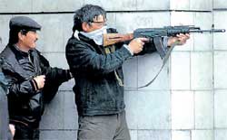<p>A group of at least 10 government soldiers were shooting with automatic weapons from the government headquarters towards a crowd of demonstrators, a Reuters cameraman said. But a group of protesters, waving red-and-yellow Kyrgyz flags, arrived in the main square on an armoured personnel carrier seized from the military. <br />Huge plumes of black smoke were billowing around the centre of Bishkek, the capital of the impoverished Central Asian state of 5.3 million people. There was intense gunfire in the centre of the city and a series of blasts. Protesters were dragging wounded people covered in blood away from the square. <br /><br />“There are dozens of dead bodies, all with gunshot wounds,” Akylbek Yeukebayev, a doctor at a Bishkek hospital told Reuters. Many of the injured in the emergency ward had gunshot wounds to their heads and stomachs. Some were moaning and asking for help. “They are killing us,” said one wounded man on the ward. <br /><br />Ex-Soviet Kyrgyzstan hosts a US military air base that helps support troops in Afghanistan, as well as a Russian base. Kyrgyz Prime Minister Daniyar Usenov, who earlier dismissed the protesters in Talas as “bandits”, said he and the president were both working in their offices. “We daren’t even look out of the window,” Kamil Sydykov, the prime minister’s spokesman, said by telephone from inside the presidential building. <br /><br />Kyrgyz opposition leader Temir Sariyev said he wanted to hold talks Bakiyev. “We’re going to the government’s headquarters,” he told Reuters by telephone. He said he would be accompanied by three more opposition politicians. Asked whom he would meet, he said: “The president, probably.” <br /><br />Sariyev was among more than 10 opposition politicians released from captivity after a crowd gathered outside the building in which they had been held. Sariyev was arrested on his arrival on a flight from Moscow earlier on Wednesday. <br />Around 1,000 people stormed the prosecutor-general’s office in the capital before setting fire to the building. Opposition activists also took control of state television channel KTR. “The political violence is likely to continue in Kyrgyzstan,” said Lilit Gevorgyan, political analyst at IHS Global Insight.<br /><br /> “Given (Bakiyev’s) resolve in recent years to concentrate power in his hands only, it is difficult to see how a political compromise may be found.” <br />Kyrgyzstan receives aid from both Russia and the United States as well as from neighbouring China.<br /><br />Bishkek also relies on remittances from migrant workers in Russia; payments that have dwindled in the last year as Russia’s economy has suffered. <br />Protesters seized government buildings in three other towns. In one town, Talas, Kyrgyz First Deputy Prime Minister Aklybek Japarov and Interior Minister Moldomusa Kongantiyev were badly beaten. Kongantiyev was forced to shout: “Down with Bakiyev!”, two witnesses said. <br /><br />The Kyrgyzstan government declared a state of emergency and said that a curfew would be enforced between 8:00 pm and 6:00 am in Bishkek and three other regions of Kyrgyzstan. <br /></p>