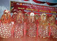 <p>The event was meant for the benefit of poor and orphan women. Each bride was gifted with 40 gm jewellry, one pair of dress, while the groom also got a pair of dress. MLC M C Nanaiah, former MLA K M Ibrahim and Athur’s Syed Ibrahim Hadi Tangal took part. So far, a total of 165 Muslim women have got married through the mass marriages organised by the Al-amin. <br /><br />The organisation has decided to conduct marriages of at least 25 Muslim females every year. Office bearers of the organisation said about Rs 26 lakh has been spent for the event. As per the ‘Adarsha Vivaha’ scheme of the government, if more than 25 pairs get marry together, each pair will get Rs 10,000. Hence, the pairs who got married on Sunday too will be getting Rs 10,000 each.<br /><br />Speaking on the occasion, MLC and former minister M C Nanaiah said the leaders of all religions should strive towards cleansing their religion from blind beliefs. “With the feeling that only their religion is superior, some people are trying to instigate violence and unrest in the society. Instead, they should strive for maintaining peace and harmony,” he said, blessing the couples.<br /></p>