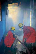 <p>The raging fire at Gold Towers where the NYXs Elite Club pub operated, was reminiscent of the Carlton Tower tragedy in which nine persons lost their lives in February. The police believe that the top-storey structure caught fire when a ‘homa’ ritual was being performed by the builders just behind the pub.<br /><br />As many as 14 fire tenders and about 100 firemen were pressed into service to douse the flames that engulfed the club around on a hot, sweltering afternoon. Thick plumes of smoke billowed from the pub kitchen as the flames, fanned by the warm breeze, licked upwards.<br /><br />It is understood that the priests perfoming the ‘homa’ poured ghee into the pit laden with firewood. The inflammable liquid caused the flames to rage all the more, and spread to a bamboo structure. The crackling fire then spread to the cable connected to an air-conditioner and a hoarding whose plastic sheet melted in no time. The entire terrace turned into a blazing orange inferno.<br /><br />The kitchen and dance floor were charred, leaving behind broken and burnt seats and glass shards across the pub premises. Traffic on Residency Road and its surrounding areas was thrown out of gear, causing snarls and long, serpentine lines of vehicles. Local residents and passersby crowded the area, watching the fire engines and the fire fighters battle the flames for close to two hours before it was put out.<br /><br />The Fire and Emergency Department, which received the first call at 1:34 pm responded to the fire instantly, but the fire engines had to negotiate heavy traffic on the busy Residency Road. According to department officials, the building owners had not obtained a no-objection certificate. They said they were probing if the four floors were unauthorised. <br /><br />“We do not have any files pertaining to the Gold Towers. There was no clearance from our side for the construction of the building and the safety standards inside,” Fire and Emergency Department DGP Jija Madhavana Hari Singh said. According to senior officials, the pub was unfit for use and had not installed any fire safety measures.<br /><br />“It is a matter of luck the fire broke out during lunch hour. There were not many people in the building, otherwise lives would have been lost,” a Fire Department official said.<br /><br />Recently, the BBMP had prepared a list of pubs running on terraces of high rising buildings, but NYX Club did not figure in it, leading to suspicions that it was operating without authorisation.<br /><br />BBMP (East) Health Officer Dr Siddappaji said he did not have any information on whether permission was accorded to the club to operate. Other civil officials said the Palike has stopped giving permission to terrace-top hotels and was not renewing licences for such restaurants, pubs or clubs. <br /><br />“The pubs and clubs operating on terrace tops had been notified that their licences would not be renewed. NYXs Club was one such,” a BBMP health department official said. <br /><br />The Director of Fire and Emergency Services B G Chengappa said the structure of this pub was apparently in clear violation of fire and emergency services’ guidelines. “Moreover, it is the responsibility of every owner to ensure that fire safety measures are installed in their buildings,” he said.<br /><br />Was homa the cause?<br /><br />The fire at the NYXs pub on Residency Road on Monday might well have been caused by a ‘homa’ which was being performed in the premises. Eye witnesses from neighbouring buildings claimed that the fire indeed started as flames from the homa had not settled down.<br /><br />According to reliable sources at the spot, around 25 priests from Benares had been invited by the owners of the building to perform the ritual at the terrace adjacent to the pub. While the homa was in progress, the flames engulfed the bamboo setting at the pub.<br /><br />Sources also claimed that the liquor at the pub aggravated the fire leading to more destruction of property. Speaking to Deccan Herald, one of the priests said he and his colleagues were caught unawares by the fire.</p>