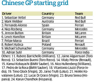 <p>The German clocked one minute 34.558 seconds to pip team-mate Mark Webber with his final lap and claim his third pole position of the year –– the eighth of his career –– and justify his position as favourite in Shanghai. <br /><br />"It was a fantastic lap," the 22-year-old said. "Fourth consecutive pole position for Red Bull, we have proved that we have a very fast car. But we'll see tomorrow, it could be wet." <br /><br />Vettel led Australian Webber to a Red Bull one-two in the last race in Malaysia as well as in the Shanghai rain last year and he will take the lead in the drivers' championship with victory on Sunday. <br /><br />While continuing one run of form, Vettel will have to break another to triumph however: None of the last five races have been won by the driver on pole. <br /><br />Two-time world champion Fernando Alonso of Spain was third quickest for Ferrari and will line up alongside the Mercedes of German Nico Rosberg, again quicker than team-mate Michael Schumacher, on the second row of the grid. Briton Lewis Hamilton led for most of qualifying but was slower in the decisive third session and had to settle for a place on the third row of the grid alongside his McLaren team-mate and world champion Jenson Button, who was fifth quickest. <br /><br />Sutil 10th<br />Force India driver Adrian Sutil made it to the third qualifying session (Q3) once again and will start tenth on the starting grid while Karun Chandhok of Hispania finished last.<br /><br />It was a mixed qualifying session for Force India with Vitantonio Liuzzi getting caught in traffic and not prospering beyond the first qualifying session (Q1). The Italian will start 18th, eight places behind Sutil who made his fourth Q3 this season.<br /><br />Karun starting</p>.<p> from the back of the grid was more or less a certainty after the Indian F1 driver was handed a five-place grid penalty by the Shanghai race stewards for mending a broken seal on his gearbox in the absence of any FIA delegate. But with Karun finishing qualifying at the back of the field in 24th, the penalty could not affect his grid position. For Force India, the onus will still be on Sutil to stretch their point-scoring streak and the German seemed up to the task.<br /><br />“Another Q3 qualifying performance for us, I think we can be very pleased with that,” Sutil said. “Again, it’s P10 –– I know this position very well from the last races in Australia and Bahrain! The car is behaving very well and we can be happy about the balance we have.”</p>