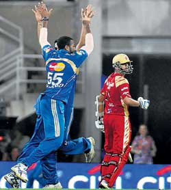 <p>The Challengers were outmuscled by Sachin Tendulkar’s warriors, who rode on a brilliant half century by Saurabh Tiwary and a brutal final onslaught by Kieron Pollard to make it to the title round for the first time.<br /><br />While the IPL’s form side awaits the winners of Thursday’s semifinal between the Chennai Super Kings and the Deccan Chargers, the Challengers will lock horns on Saturday with the other beaten semifinalists in a bid to secure third place and clinch the final Champions League berth.<br /><br />The significance of posting runs on the board in the pressure-cooker situation of a cup semifinal was reiterated by the Mumbai Indians, who made the most of Tendulkar’s luck with the coin to amass 184 for five. It wasn’t a total that looked likely when Kumble and Kevin Pietersen spun a web of deceit around the batsmen, but Tiwary’s calculated assault and Pollard’s breathtaking final flourish took the game beyond the reach of the Challengers.<br /><br />The last five overs produced a massive 77 runs, Pollard smashing 33 off just 13 deliveries, as the Challengers were left facing a gargantuan run-chase.<br /><br />Except for a brief while when the flair of Robin Uthappa combined with the experience of Rahul Dravid, the Challengers were never really in the hunt. Both were dismissed off successive deliveries after a promising stand of 34, after which the rest found it well nigh impossible to conquer the discipline of the Mumbai Indians bowling and the demands of a spiralling run rate.<br /><br />Indeed, the biggest worry for the Indians came when Tendulkar exited the park in the fourth over with a bleeding right hand after making a spirited attempt to catch Dravid at slip, even as the Challengers were left bleeding all over by Pollard’s broadsword. The little master split a webbing and required five stitches, but it should take a lot more than that to keep him out of Sunday’s title tilt.<br /></p>