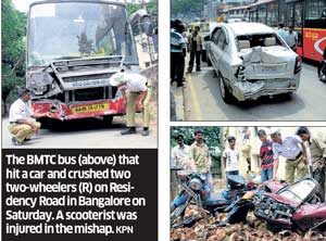 <p>The dead man is Nagaraj Naik (26), a resident of Kumbara street in Ulsoor. He was working as an attender at St Joseph’s College of Business Administration on Residency Road. Syed Imtiyaz Rizwi (54), a resident of Banashankari and a BSNL employee was was admitted to St Philomena Hospital for treatment of injuries.<br /><br />The incident led to traffic jam for nearly half an hour. Despite a major road accident and a dead body lying on the road, vehicle users tried scramble their way through. Continuous honking and trying to jump the traffic signal led to a chaotic situation. The traffic police had a tough time in ensuring smooth traffic flow.<br /><br />Around 9.45 am, a BMTC bus was awaiting the green signal at Ashirwadam Circle. Nagesh came out of the college campus on his moped and stopped behind the bus. A scooterist, Rizwi, was slightly behind Nagesh, while a car was behind Rizwi. <br /><br />Another BMTC bus plying between Majestic-Marathalli sped up from behind. The bus driver, Subbarayappa, lost control when he neared the Circle and rammed into the car and the scooter. The car and the scooter were thrown to the right side of the road. Rizwi fell and sustained injuries. The speeding bus then hit Nagaraj from behind. Nagaraj was crushed between the two buses with his moped. The intensity of the accident was such that he was killed on the spot due to multiple injuries, while his moped was mangled. The car, scooter and the parked BMTC bus were also damaged.<br /><br />Subbarayappa jumped out of the bus and surrendered at the Ashoknagar police station. Rash and negligent driving by Subbarayappa caused the accident, said the police. <br /><br />Both the two-wheeler riders were wearing helmets when the accident took place. Rizwi got his hand fractured. He was on his way to office, while Nagaraj was returning to the college after collecting breakfast for the staff. A native of Davangere, Nagaraj had joined St Joseph’s College five years ago. He leaves behind his wife who is carrying their second child, and their two-year-old son.<br /><br /></p>