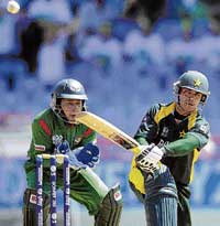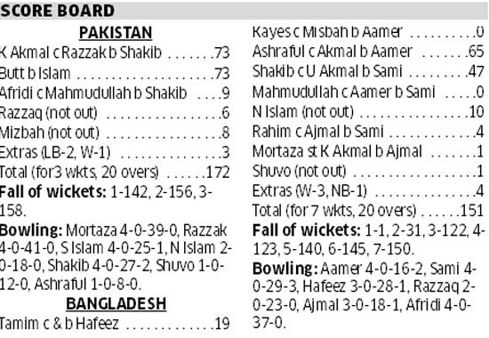 <p>After a setting a steep target of 173, Pakistan survived a big scare to emerge 21-run winners over Bangladesh in their Group A clash here on Saturday.<br /><br />Opting to bat, Pakistan got off to a rollicking start with openers Kamran Akmal (73, 55b, 8x4, 1x6) and Salman Butt forging a formidable association. The right-left duo punished all Bangla bowlers during its mammoth 142-run stand which formed the basis of Pakistan’s imposing 172 for three. Bangladesh finished at 151 for seven. <br /><br />It was a match sealed for Pakistan once they stacked up the big total, or so it appeared. Ashraful (65, 49b, 4x4, 3x6) and Shakib (47, 31b, 3x4, 2x6) took the battle to the rival camp before Mohammad Sami swung it Pakistan’s way. <br />Despite a poor start, Bangladesh set off alarm bells as Ashraful and Shakib raised 91 runs between them. <br /><br />Earlier, Pakistan rode on Butt and Kamran’s contributions at the top of the order. While Kamran’s T20 credentials are well established, Butt’s showing came as a pleasant surprise for them. For all his impressive record in the one-dayers, Butt has always been found wanting in T20. But on the day the southpaw set the record straight with a sparking 73 (46, 8x4, 2x6). <br /><br /></p>