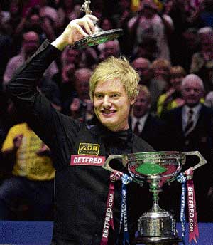 <p>Resuming the evening session with a 12-10 lead, Robertson went on to beat former champion Dott 18-13 at the Crucible Theatre to claim the title.<br /><br />"It's an amazing feeling to be world champion after a Titanic struggle of a match," a relieved Robertson said. "The pressure before the final and during the final was absolutely unbelievable because there's so much at stake." <br /><br />However, the final showdown was somewhat overshadowed by the match-fixing allegations surrounding last year's champion John Higgins, which surfaced just hours before the contest got underway. <br /><br />Robertson took a 12-10 lead over 2006 champion Dott into the final session on Monday, which rolled on past midnight.<br />At 14-12 ahead with the reds cleared, Robertson missed a crucial brown to the left middle pocket at 57-40 up. But he went on to sink the pink and take the 45-minute frame for a three-frame lead.<br /><br />Robertson put the white down but Dott missed his subsequent shot and the Australian went on to take the frame 58-10 for a 17-13 lead. Robertson broke off in the final frame, in which both players showed their fatigue. Robertson played a plant for a 42-1 lead and the match time rolled past 12 hours.<br />He sank a pink to leave Dott needing snookers, then blew a kiss to his mother, clutching the Australian flag.</p>