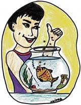 <p> A fish bowl? With a gold fish? In his room? What was it doing here? Rohan hated pets. They were loud, messy, and demanded constant attention and care. But, well, he couldn’t say the same about fish, thank god for the noise bit, and the constant need for attention and petting. He wasn’t sure about the messy bit though as well as the part about taking care. <br /><br />Why, he couldn’t even take care of himself, forgetting to brush his teeth, or running a comb through his hair or wearing clean socks to school, and of course rarely remembering to do his homework. How on earth would he take care of another living creature? <br /><br />“Ma, what’s this fish bowl doing in my room?” he demanded loudly. <br />“Oh, that!” Said his mother coming in, “That’s Rashmi-aunty’s belated birthday gift.” <br />“Couldn’t she think of anything else? The skate-board that I always wanted, the sweatshirt, I’ve been dying for? What will I do with this uuh this…this…uh.” <br />“Gold fish,” helped his mother. <br /><br />“Ya, gold fish. I don’t want it,” he said irritated. <br />“Aha, you should never say ‘no’ to a gift.” <br />“But I don’t know anything about fish!” he exclaimed. <br /><br />“Good. Here’s a chance to learn something new!” Said his mother, closing the door. <br />She sighed. She didn’t know what to do about her son. He was getting quieter and quieter; he kept to himself, avoiding friends, talking back rudely and being selfish and uncaring. She was sorry about not being able to spend more time with him, but she had a job too and looking after a house didn’t come easy. <br /><br />Rohan looked quizzically at the gold fish for a few more minutes. The fish looked like it had an attitude that said, “I don’t care whether you like me or not; I’ll stay right here and keep swimming in circles.” <br /><br />Rohan threw up his hands, “Ok! You win! I’ll keep you for week. Only a week. And then you are out!” <br /><br />Did the gold fish just flash a smile and swim a little faster? Rohan couldn’t say. <br />The next day, Rohan, who had never visited the school library, and didn’t know where it was, managed to find his way there. He was quite ashamed to ask the strict librarian how to search for books. <br /><br />The irritated librarian showed Rohan how to go through the computerized catalogue. Rohan spent a whole afternoon going through books of fish care. He read up all about gold fish; he learnt about fish food, about the tiny amounts they needed several times a day, that he had to change the water weekly so that the fish could stay healthy. <br /><br />On his way back from school, he found a pet store and bought some food fish, and a few colorful things to put in the fish bowl. He had never bought anything for anyone before. And was excited about the gift. At home, he sprinkled a little of the fish food, and watched how the goldfish nibbled at the tiny flakes, though the fish didn’t seem the least bit excited about the gift. <br /><br />“Cleo, that’s what I am going to call you,” said Rohan. <br />Over the next few days, strange things began to happen to Rohan. It all began one night, when he couldn’t sleep. He lay tossing and finally switched on the bed lamp and saw Cleo swimming in slow circles in the fishbowl. <br /><br />“So, you’re awake too. Looks like we are the only ones awake in the world now!” He said. <br /><br />He could’ve sworn Cleo smiled and nodded. And then just like that he started talking. And he talked and talked and talked through the entire night! He had never felt like talking to anyone before about his school friends, the fights with them, the patch ups, the crush he had on Shweta and what he day-dreamed when the teacher was lecturing, and most of all what he felt in his heart about his mother, whom he really loved, but thought it too girlie to tell. <br /><br />And suddenly here he was sharing his entire life with Cleo, his gold fish! <br />His mother noticed the changes, Rohan was becoming more responsible; she wasn’t getting any more notes from his teacher; he didn’t throw his clothes around in a mess, he ate his meals at the table with her and not alone in his room, and many such little changes. She wasn’t sure who was really responsible, though she felt the fish had something to do with it. <br /><br />So, one day, when she thought Rohan was out, she crept up to the fishbowl and said, “Psst. This is really weird. I can’t believe I’m talking to a goldfish. But I’ve been meaning to tell you something. If you have anything to do with Rohan’s sudden change, thank you! Thank-you!” <br /><br />“You’re a fish talker too!” Said Rohan stepping out of the bathroom, laughing. His mother, pointed at him and then the fish and then both fish-talkers collapsed on the bed laughing uncontrollably. <br /><br />They were of course joined by tiny bubbles of laughter from the fish bowl too!</p>