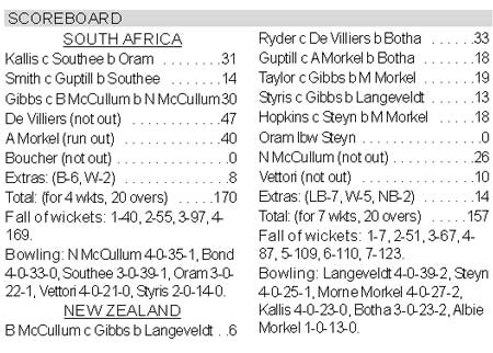 <p>De Villiers played sensibly for his 39-ball 47 while Albie Morkel bulldozed the South African attack to all parts of the ground in his 18-ball knock to share 72 runs off just 38 deliveries for the fourth wicket and propel South Africa to 170 for four.<br /><br />Chasing 171 for victory, New Zealand batsmen found themselves in trouble against the disciplined South African attack, which was backed by some extraordinary fielding and eventually could manage 157 for seven. New Zealand’s run chase started on a disastrous note as Brendon McCullum failed yet again. Brendon McCullum was spectacularly caught by Gibbs at cover of the innings’ fifth ball from Charl Langeveldt. Jesse Ryder (33) and Martin Guptil (18), however, got the Kiwi innings on track with a 44-run second-wicket stand but SA did not let things go from their hands.<br />PTI<br /><br /></p>
