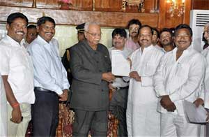 <p>After dilly-dallying for nearly a month, the BJP on Monday withdrew support to the Shibu Soren government in Jharkhand reducing it to a minority.<br /><br />Deputy Chief Minister and BJP leader Raghuvar Das handed over the letter withdrawing support to the Soren government to Governor M O H Farooq.<br /><br />"I have handed over the letter of withdrawal of support to the governor.<br /> When the governor asked me about the signatures of party MLAs, I said I will collect them and hand them over by tomorrow," Das told reporters at the Raj Bhavan.<br />The Governor said he will "study it."<br /><br />Frustrated over JMM backtracking on its power-sharing agreement in Jharkhand, the BJP had decided yesterday to withdraw support after a defiant Soren asserted that he would continue as the chief minister and was in touch with Congress.<br /><br />The BJP parliamentary board had on April 28 decided to withdraw support to the JMM government after Soren voted against the party-sponsored cut motion against the UPA Government in Lok Sabha a day earlier.<br /><br />However, the decision was put on hold when JMM Legislature party leader and Soren's son Hemant wrote a letter to BJP chief Nitin Gadkari pledging support to a BJP-led government.<br /><br />But, the JMM backtracked and demanded rotational power sharing with each party leading the government for 28 months. This was agreed to by BJP on the understanding that Soren will quit as Chief Minister by May 25 after which Munda will head the new coalition government.<br /><br />As the deadline for his stepping down approached, Soren made it clear on Friday that there was not going to quit.<br /><br />"The question of a change of government comes if there is no development. But now development is going on," he had told reporters.<br /><br />The Chief Minister had on Saturday went a step further saying he was weighing all options, including cutting a deal with the Congress to continue in power.<br /><br />The Soren government now has 27 MLAs, including 18 of its own, five of the AJSU, two of JD(U) and two others in support in the 81-member House. <br /><br />Das also claimed the JDU, which has two MLAs, supported BJP's decision to withdraw support as it was a part of the NDA.<br /><br />The BJP, he said, took the extreme step because of the alliance partner JMM's varying statements.<br /><br />Asked whether the BJP would prefer President's Rule, Das said it depended upon Raj Bhavan.<br /><br />"I don't deny any possibility, but we would like a strong and stable government," he said.<br />BJP's National General Secretary, Arjun Munda, who was present at Raj Bhavan, refused to comment when asked why his deal with Soren failed.<br />To a question, he said, "The Congress is creating a vicious political atmosphere in the state ... the Raj Bhavan should keep democratic values in mind before taking any step."<br />Three ministers from the BJP, Baijnath Ram, Barkuanr Gagrai and Nilkant Singh Munda were also present when Das handed over the letter to the governor</p>