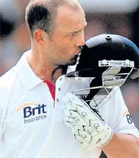 <p>Trott stroked an unbeaten 107 as England prospered at the expense of the threadbare Bangladesh attack to reach 231 for three at tea after being put in to bat.After helping England regain the Ashes at the Oval last year with 119 on his Test debut, Trott struggled in the subsequent series in his native South Africa and in Bangladesh.<br /><br />Under pressure on Thursday to justify his Test spot, Trott carved a boundary from his third delivery after Alastair Cook had been dismissed lbw for seven.He batted with increasing authority, reaching his hundred with his 12th four from 133 balls.<br /><br />Andrew Strauss was denied a century on his return to the national side when he chopped a straight delivery on to his stumps during the second session.The England captain started slowly but then got into his stride to compile 83.</p>.<p>Shakib Al Hasan's decision to field first on winning the toss on a cool, overcast morning was quickly exposed after Cook had been dismissed propping half-forward to Shahadat Hossain.<br />Hossain bowled with energy and verve but, in common with his team mates, he was rendered innocuous as the sun began to shine and sapped any early life from the pitch.<br />Shakibdemonstrated the paucity of his bowling resources by coming on as first change at the Nursery End with his left-arm spin.He conceded 49 from 12 overs before switching to the Pavilion End 20 minutes before tea where his luck changed when he comprehensively bowled Kevin Pietersen for 18.</p>