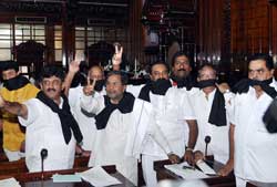 <p>The passage of the bills was put on fast track thanks to the absence of Opposition members in both the Assembly and Council where they have been able to prevent legislative business for the past three days, demanding, among other things, a CBI probe into illegal mining and the resignation of Chief Minister B S Yeddyurappa.<br /><br />What was noteworthy was that since the Opposition preferred to stay away from conducting any legislative exercise, the bills were passed without any discussion and debate. The Assembly sped through six bills, received clearance for drawing allocations for 28 departments and was done with Question Hour in 40 minutes.<br /><br />The Council too matched the lightning speed with which the Assembly wrapped up proceedings in the event of non-cooperation from the Opposition benches. <br />It accorded consent to the passage of nine bills, including the vexatious bill on banning cow slaughter and the Alliance Private University Bill, in 45 minutes spanning two sessions.<br /><br />Bills of paramount public importance, including legislation that seeks regularising unauthorised buildings and sites and the IT Investment Regions Bill for setting up a 10,000-acre info-tech park around Devanahalli near Bangalore, were passed without any debate in the Council.<br /><br />Demands for grants for 28 departments were tabled and passed in no less than 12 minutes. Usually, discussions on money bills last for five to six days in the legislature. As many as three bills were tabled and six bills passed by voice-vote. The ruling BJP has 121 members in a House of 224 members.<br /><br />Unmindful of the Opposition dharna, Assembly Speaker K G Bopaiah and Council Chairman D H Shankaramurthy conducted official business in accordance with the legislative agenda. <br /><br />The unusual situation that the Assembly and the Council witnessed on Thursday is due wholly to the Congress and JD(S) members’ ceaseless agitation over their demand for a CBI probe into illegal mining in the state, a demand that Yeddyurappa has been loathe to concede to.<br /><br />Donning black scarves, Congress legislators started their agitation on Thursday on a sedate note by resorting to silence. But when the chairpersons took up official business in accordance with the agenda, they started raising slogans against the ruling BJP.</p>.<p>During Question Hour in the Assembly, no member tabled any question when the Speaker called out the names of the legislators. As proceedings took on their pace, pandemonium broke out in the Assembly. Opposition members tore up copies of the bills and agenda papers and flung them in the House.<br /><br />Shrieking and shouting slogans, the Congress MLAs removed their black scarves and waved them atop their heads in defiance. On the other hand, BJP members, who are otherwise quite vocal, maintained a stoic silence in the face of the Opposition agitation and unruliness. While the BJP members’ collective discipline helped the respective ministers to introduce the bills, voices from the Treasury benches arose only after the proposed legislations were put to voice vote.<br /><br />Besides the Sakrama and ITR Bills, the Karnataka Irrigation and Certain Law (Amendment) Bill, the BWSSB (Amendment) Bill were passed without any debate. The Council adopted three bills in the morning session within 10 minutes and six more in the evening amidst the dharna by the Opposition. <br /><br />While Leader of the Opposition Siddaramaiah termed the conduct of business as a ‘‘murder of democracy’’, JD(S) leader M C Nanaiah said that the government adopted deceptive means to pass the bills.<br /><br />Predictably, Yeddyurappa found fault with the Opposition non-cooperation, though he apologised to the people of the state for the passage of the bills without debate. He said the Opposition would seek Governor H R Bhardwaj’s intervention in the manner in which the government passed the bills.<br /><br />The Opposition members continued their day-night dharna for the fourth consecutive day. Former Prime Minister and JD(S) leader H D Deve Gowda and party MP H D Kumaraswamy attended a legislature party meeting at the Vidhana Soudha. </p>