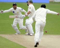 <p>Australia were 136 for two in their second innings, just 34 behind, when bad light forced an early close on the second day.<br /><br />Ponting, the Australia captain, was 61 not out -- the first fifty of the match on either side -- and Michael Clarke 32 not out following a wicketkless final session.</p>.<p><br />Their stand was worth 81 -- almost as many as Australia made when dismissed for just 88 in a dramatic first innings collapse.<br /><br />Australia had been 170 behind on first innings after Pakistan made 258.<br />All-rounder Shane Watson took six wickets for 33 runs in 11 overs -- the second time in as many matches he has taken Test-best figures -- as Pakistan failed to bat Australia out of the game.<br /><br />Australia have won their last 13 Tests against Pakistan and in January triumphed by 36 runs at Sydney despite a first innings deficit of 206.Ponting’s innings saw him get the 40 runs he needed to join India great Sachin Tendulkar as the only other batsman to have scored 12,000 Test runs.<br /><br />An edged four to third man off left-arm quick Mohammad Aamer took Ponting to the milestone on a ground where he made his first Test hundred back in 1997.<br />Mohammad Asif’s figures of none for 42 off 13 overs were harsh on the seamer, who saw a number of close calls against both Ponting and Clarke go in the batsmen’s favour.<br />And when he did err, Ponting pounced to force Asif through cover point and pull him for well-struck fours in nearly three hours at the crease.<br /><br />Australia were 62 for two, still 108 behind, at tea. Ponting had survived several lbw appeals while padding up to be 18 not out and Clarke was unbeaten on two.<br />Watson helped Ponting add 40 for the second wicket. But the opener, on 24, fell to occasional medium-pacer Umar Amin when he played on trying to cut and Australia were 55 for two.<br /><br />Australia’s second innings, like their first, began under grey skies.<br />And when opener Simon Katich was bowled round his legs, after shuffling across the crease in trademark fashion, by Aamer, Australia were 15 for one and in danger of a fresh collapse. The 18-year-old Aamer might have had Ponting lbw for nought when the star batsman padded up and played no stroke to an inswinger. But Rudi Koertzen, in the South African’s last Test as an umpire, was unmoved. <br /><br />Watson, who took two wickets on Wednesday, produced a post-lunch burst of four wickets for seven runs in 13 balls as Pakistan were dismissed for 258.<br />Score board:<br />AUSTRALIA (I Innings) 88 all out<br />PAKISTAN (I Innings, O/n 148/3)<br />Farhat lbw Watson 43<br />Butt b Hilfenhaus 45<br />Ali c Paine b Watson 30<br />Amin c North b Hilfenhaus 25<br />U Akmal c Paine b Johnson 21<br />Malik c Paine b Watson 26<br />K Akmal c North b Watson 15<br />Aamer lbw Watson 0<br />Gul b Watson 0<br />Kaneria (run out) 15<br />Asif (not out) 9<br />Extras (B- 11, LB-9, NB-9) 29 <br />Total (all out, 64.5 overs) 258<br />Fall of wickets: 1-80, 2-133, 3-140, 4-171, 5-195, 6-222, 7-222, 8-224, 9-234.<br />Bowling: Doug Bollinger 17-4-50-0, Ben Hilfenhaus 20.5-3-77-2, Shane Watson 11-3-33-6, Mitchell Johnson 15-0-71-1, Steven Smith 1-0-7-0.<br />AUSTRALIA (II Innings)<br />Watson b Amin 24<br />Katich b Aamer 11<br />Ponting (batting) 61<br />Clarke (batting) 32<br />Extras (B-4, W-2, nb-2) 8<br />Total (for 2 wkts; 41 overs) 136 <br />Fall of wickets: 1-15, 2-55.<br />Bowling: Mohammad Aamer 9-2-19-1, Mohammad Asif 13-1-42-0, Umar Gul 5-0-36-0, Umar Amin 6-1-12-1, Danish Kaneria 8-0-23-0.</p>