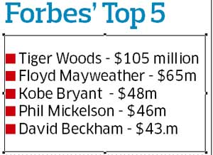 <p>Woods claimed the top spot on a 2010 US list of 50 athletes for the seventh consecutive year compiled by Sports Illustrated's SI.com, though his total earnings fell 10 percent to $90.5 million. His total is also down 40 percent from $127.9 million in 2008. <br /><br />Woods also topped Forbes magazine's 2010 list of the top 50 earning athletes in the world at $105 million, down 4.5 percent from last year as the star golfer has lost such sponsors as Accenture Plc and AT&T Inc. It was the ninth consecutive year he topped the Forbes list. <br />Tennis star Roger Federer, at $61.8 million, bumped soccer player David Beckham from the top spot he had held the last two years on the international list, SI.com said. <br /><br />Woods' earnings for the 2010 list are comprised of $20.5 million in earnings and $70 million in endorsements from such sponsors as Nike Inc and Electronic Arts Inc, SI.com said. Woods' endorsement earnings fell $22 million from last year's list. <br /><br />On the international list, Federer jumped from No 9 last year as his earnings doubled, while Beckham slipped to No 3 at $40.5 million behind FIFA world soccer player of the year Lionel Messi at $44 million, according to SI.com. <br /><br />Rounding out the international top five were soccer player Cristiano Ronaldo ($40 million) and boxer Manny Pacquiao ($38 million), SI.com said. Tennis player Maria Sharapova was the only female athlete to make either list, ranking No 20 on the international list at $19.9 million. <br /></p>