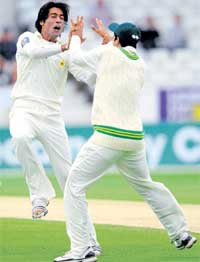 <p>Pakistan, chasing 180 for victory, reached 140 for three in 37 overs to edge nearer to their first Test victory over the Australians in 15 years. A Pakistan win would also deny Australia an eighth straight Test win. <br /><br />Azhar Ali was 47 not out and Umar Akmal was on two when the players left the field despite bright sunshine. <br />Left-arm fast bowler Doug Bollinger claimed the late wickets of Farhat, who was bowled, and Umar Amin for a duck. Both wickets fell caught behind with the score on 137 to give Australia a glimmer of hope. <br /><br />Australia, skittled for just 88 on the opening day, fared better second time around. <br /><br />Resuming at 136 for two on Friday, Steven Smith scored an enterprising 77 off just 100 balls between lunch and tea, with nine fours and two sixes, to boost Australia's hopes after Michael Clarke made 77 and captain Ricky Ponting 66. But their first innings may ultimately have cost them. <br /><br />Pakistan, who will hope to banish the painful memory of Sydney in January when they were bowled out for 139 when chasing 176, began their run chase nervously. <br />Farhat, who was dropped by Shane Watson at first slip, raised his half-century with a square cut off a short and wide Johnson delivery for one of his nine boundaries. <br /><br />Score board<br />AUSTRALIA (I Innings) 88 all out<br />PAKISTAN (I Innings) 258 all out<br />AUSTRALIA (II Innings, O/n 136/2)<br />Watson b Amin 24<br />Katich b Aamer 11<br />Ponting c K Akmal b Aamer 66<br />Clarke c K Akmal b Asif 77<br />Hussey c U Akmal b Aamer 8<br />North b Aamer 0<br />Paine c Ali b Kaneria 33<br />Smith b Gul 77<br />Johnson lbw Asif 12<br />Hilfenhaus c U Akmal b Kaneria 17<br />Bollinger (not out) 0<br />Extras (B-4, LB-10, W-2, NB-8) 24 <br />Total (all out, 95.3 overs) 349<br />Fall of wickets: 1-15, 2-55, 3-144, 4-158, 5-164, 6-217, 7-246, 8-283, 9-320.<br />Bowling: Aamer 27-6-86-4, Asif 26-4-83-2, Gul 15.3-1-80-1, Amin 6-1-12-1, Kaneria 21-2-74-2.<br />Pakistan (II Innings)<br />Farhat b Bollinger 67<br />Butt c Clarke b Hilfenhaus 13<br />Azhar (batting) 47<br />Amin c Paine b Bollinger 0<br />U Akmal (batting) 2<br />Extras (lb-6, nb-5) 11<br />Total (for 3 wkts, 37 overs) 140<br />Fall of wickets: 1-27, 2-137, 3-137.<br />Bowling: Bollinger 8-1-37-2, Hilfenhaus 6-1-16-1, Johnson 9-1-39-0, Watson 5-1-18-0, Smith 9-2-24-0.<br /></p>