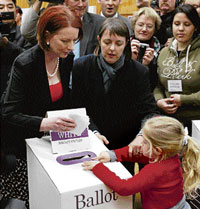 <p>With 43 percent of the vote counted, Prime Minister Julia Gillard's Labor Party has 50.3 percent against 49.7 percent received by the opposition coalition led by Liberal Party leader Tony Abott.<br /><br />The Australian Electoral Commission announced 51 seats for Labor, 45 for the opposition coalition and three for independent candidates. It had 51 seats still in doubt.<br />In New South Wales, there was a swing of 4.77 percent away from Labor with 35 percent of the vote counted. In Queensland, with 41 percent of the state's vote counted, there's a 5.45 percent swing against Labor.<br /><br />In Victoria, with 33 percent of the vote counted, Labor experienced only a marginal swing of 0.67 percent against it. In South Australia, the conservatives have a slight swing of 0.1 percent with 18 percent of the vote counted, according to Australian news agency AAP. A Sky News exit poll, conducted in 30 key marginal seats Saturday, showed the vote went 51 percent to Labor and 49 percent to the conservatives.<br /><br />A Nine Network exit poll has also forecast a close win for the incumbent prime minister, with her Labor Party picking up 52 percent of the overall vote to 48 percent for the opposition.<br /><br />But the poll also reported sharp swings against Labor in crucial marginal seats in Queensland and New South Wales. Former Labor prime minister Bob Hawke said while he was comforted by exit polling, all three possibilities - a Labor victory, a coalition victory or a hung parliament - are still possible.<br /><br />Former Democrat senator Natasha Stott Despoja expects a Labor victory. "I think that Labor will sneak across the line and I think that's because of the deal they've done with the Greens," she said. "Those preferences, I think, will be crucial to hanging on to a number of seats."<br /><br />The conservatives need 17 Labor seats to win the election by garnering a uniform swing of 2.3 percent across the country. But the government can lose its absolute majority if it loses 13 seats. Fourteen million voters are enrolled to have a final say on who becomes prime minister. But the final outcome will be delayed by two weeks as around 2.35 million voters cast votes by post, The Australian Electoral Commission said.<br /><br />According to the Australian electoral law, postal votes cannot be finalised until 13 days after polling day. The counting of votes cast outside the voter's electorate, and postal votes, will not begin until Sunday.<br /><br />Senior Liberal senator Nick Minchin said he would not be surprised if there is no result Saturday night.After spending Saturday morning in the crucial western Sydney seat of Lindsay, Gillard returned to her home town of Melbourne, beaming for the cameras and declaring "there it is" as she cast her vote for her health minister Nicola Roxon.<br /><br />Due to a boundary redistribution, Gillard's home suburb of Altona is no longer in her electorate of Lalor. "I'm exercising my own vote," Gillard told reporters. She said it was a "tough, tight, close contest", but she was "very, very happy to be back in Melbourne".<br /><br />Abbott voted in his Sydney seat of Warringah, queuing up with his wife Margie and their three daughters - Louise, Frances and Bridget. "This is a big day for our country. It's a day when we can vote out a bad government," Abbott said.<br /><br />A Nielsen poll shows Labor with a slight lead, while a Newspoll has the major parties deadlocked. Former prime minister John Howard said he thought Abbott fought a wonderful campaign.<br /><br />"He brought the opposition back from the dead only a few months ago and I don't think a bad government deserves a second chance," Howard said Saturday.<br />However, Labor remained the bookmakers' favourite to win.</p>
