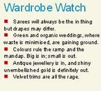 <p>If you want to make a personal style statement on your wedding day, the obvious choice is to splurge on clothes. Shine Teresa, chief designer, Kanate Originals, says: “If you have a fabulous figure, then sexy, slinky silhouettes are ideal, but for those who loved the fitted and fabulous gowns from the movie Gone with the Wind, those are in too; ballroom gowns are back, squishing you into shape and giving you a fabulous cleavage.”<br />Deepika Govind, popular designer, says the predominant colour palette is in shades of rose and off-white. <br /><br />“Huge volume or flare in the lehengas testifies that tradition is going strong. The motifs are elegant and delicate, crafted in antique hues. Embroidery is seeing the use of antique material (zari, sequins, zardosi, etc) and threadwork. Cholis are tiny, with a deep back or a backless style, tiny sleeves, interesting necklines and the two-dupatta concept is popular as is vintage lace,” she observes. <br /><br />Chiraag Dattani, who specialises in ethnic men’s wear, says: “For the big day for the bridegroom, soothing colours like ivory, gold and white with cuts like royal rajwada and Jodhpuri sherwanis — paired with churidar or dhoti — are popular. Minimal work around the chest is in, along with accessories like the traditional head gear in gold or tissue, and pearl malas around the neck. The key is less embroidery and more accessories.”<br /><br />Sparkle and shine<br /><br />Undoubtedly, the best part of trousseau shopping is jewellery buying. Changing times, tastes, globalisation and extreme economic scenarios have all influenced the modern bride’s choice of jewellery. <br /><br />“Today’s bride has the same love and passion for jewellery that her mom and grandmom had, but she does not like stashing away her jewellery in a bank vault. Diamond jewellery with bespoke designs rule the day. And, this has led to the popularity of use of both precious and semi-precious stones in wedding jewellery. What matters is jewellery that has struck the perfect balance between the trendy and the traditional,” says Shehzad Zaveri, MD, Minawala. <br /><br />“Jewellery styles even in South India have become more elaborate — bigger pieces are now welcomed and we see more colours in gemstones,” says C Vinod Hayagriv, Managing Director, C Krishniah Chetty & Sons. <br /><br />Sirish Chandrashekar, Senior Manager (Marketing), Tanishq, says: “Jewellery for the muhurat ceremony is likely to be a family heirloom — jadau, nakashi, uncut diamonds, precious coloured stones like rubies and emeralds. If not, then antique jewellery — gold with a burnished look is the current trend. This goes well with the zari and zardosi work on most Indian wedding clothes.”<br /><br />Bring on the add-ons<br /><br /></p>.<p>Weddings are not just about clothes and jewellery. There are a host of ancillary issues that are part of the wedding jamboree. Fraxel, botox, tooth whitening, microdermabrasion and hair reduction are some of the top treatments being done on brides-to-be. <br /><br />Dr Pritam Pankaj, senior cosmetic laser surgeon, New Look Cosmetic Skin Laser Centre, New Delhi, says: “More young women than ever before are choosing cosmetic surgery to look their best on their wedding day.”<br /><br />Return gifts are a big part of the shopping. Tanmay Ayare, who got married in March this year, says: “At my wedding, we gave a pair of floating candles with personalised messages to close family members and friends and were happy to see their pleased reaction.”<br /><br />Jenny Haokip, make-up specialist, Lord & Berry, says: “Brides come to us for their make up, demanding a bright look; they want a bright shade of eye shadow and lipstick and dark kajal, but it depends on their complexion and skin.” <br /><br />She says elaborate bridal make-up packages can cost anything between Rs 10,000 and Rs 25,000. <br /><br />Hot trends<br /><br /></p>.<p>Trousseau shopping is fun all the way. Trendy sarees — not kanjeevarams or heavy silk sarees — are in great demand. Apart from shopping for the main ceremony, buying for other occasions is fun. <br /><br />“It’s also important to shop for good inner wear that fits well. Attention must be paid to funky accessories too,” says Krupa Sumanth, Founder, Impressionz. <br /><br />In fact, the concept of splurging for a wedding is catching up big time with several special exhibitions and fairs being organised solely for wedding shoppers.<br /><br />Trousseau Trails at UB City in Bangalore features a bridal fashion show with brands like Kimaya, Minawala, Paul Smith, Canali, Etro and Estee Lauder showcasing their best in trousseau collections. <br /><br />From gifting and packaging to mehendi and cake-tasting sessions, this festival promises to be a one-stop destination. <br /><br />Divya and Vithika, wedding planners, say: “We are seeing people move away from traditional wedding cards. They prefer to get the invitations custom- designed to incorporate their personal style. Whether it is water colours or Tanjore paintings, the aim is to get a one-of-its-kind invitation.” <br /><br />‘Wedding Special’ collections are being launched by leading designer wear brands. Italy’s luxury menswear brand Canali has recently launched their Nawab collection, inspired by the rich, sophisticated history of the maharajas’ era. <br /><br />List it to remember it!<br /><br /></p>.<p>The best way to start shopping is make to make a detailed list of things you need. The list should include the most minute need of shopping, including where to get the outfits tailored. Given how important it is to have a wedding budget and organised planning for wedding shopping, we are always surprised to see how this rule is ignored by most Indian families in the excitement to get everything up and running. <br /><br />Before you buy your outfits for the wedding and reception, make sure you know the colour scheme for the ev