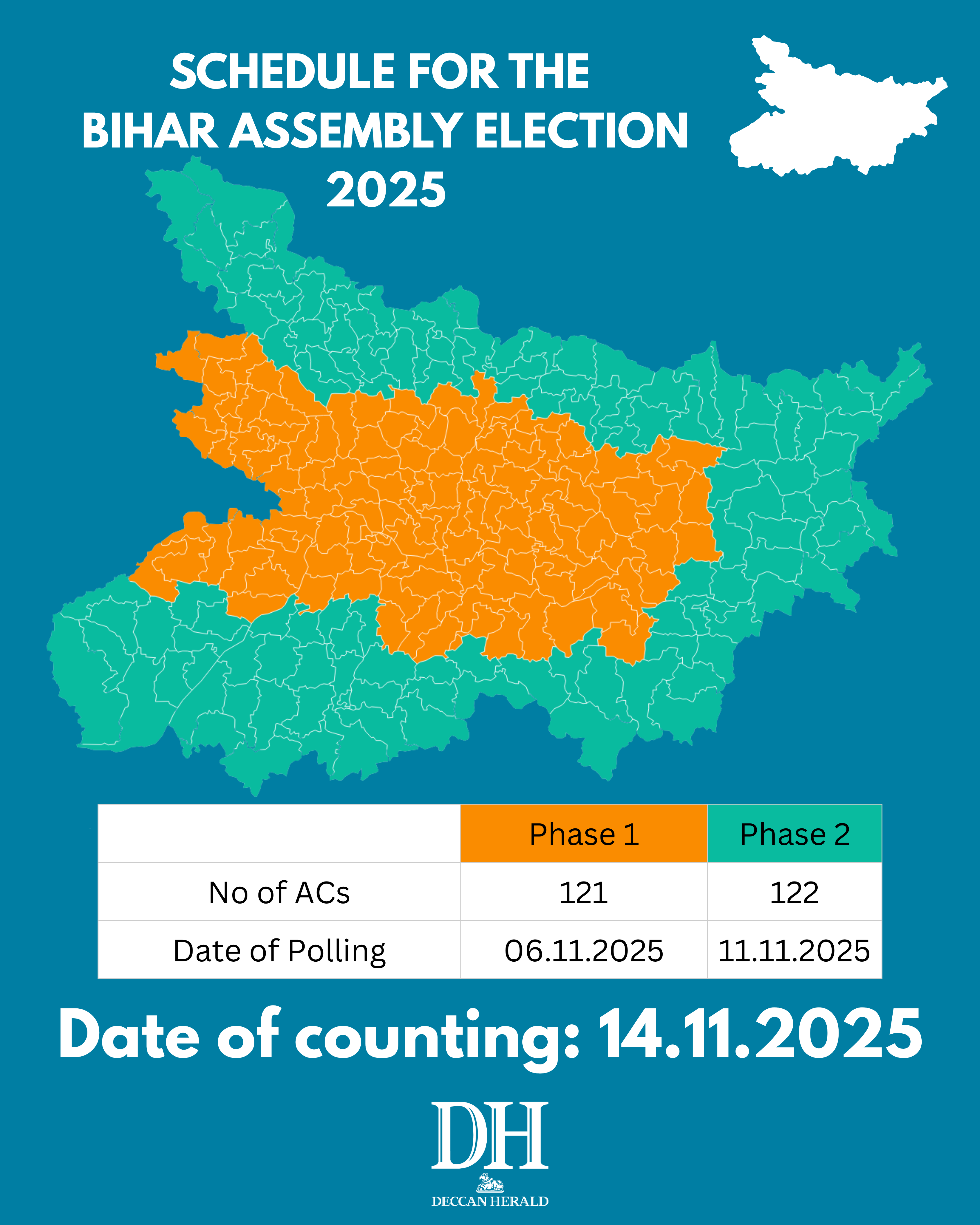<p>Chief Election Commissioner (CEC) Gyanesh Kumar announced the dates of the <a href="https://www.deccanherald.com/tags/bihar-assembly-elections-2025">Bihar Assembly Elections 2025 </a>in a press conference on Monday.</p><p>Voting for will be held in two phases -- November 6 and 11 -- with the counting of votes slated for November 14. </p>. <p>It is worth remembering that the 2020 Assembly polls in the state were held in three phases under the shadow of the Covid-19 pandemic.</p>.Bihar Assembly Elections 2025 | NDA gears up for polls with freebies galore.<p>Over 7.4 crore people are eligible to vote in the ensuing elections including 14 lakh first-time voters.</p><p>The CEC asserted that the Bihar elections will be conducted in a transparent and peaceful manner.</p><p>"There are a total of 7.42 crore voters in Bihar, of which 3.92 crore are males and 3.5 crore are women. There are 14 lakh first-time voters and 4 lakh senior citizen voters," Kumar said at the press conference.</p><p>Here are the key takeaways from Kumar's press conference.</p>.<p>Voting will be held in two phases -- November 6 and 11</p>.<p>Counting of votes will be held on November 14</p> .<p>The entire process will be concluded by November 16.</p>.<p>The term of the current 243-member state assembly ends on November 22.</p>.<p>As per EC data, there are a total of 7.42 crore voters of which 3.92 crore are males and 3.5 crore are females. There are 14 lakh first-time voters and 4 lakh senior citizen voters.</p>.<p>At least 14,000 voters in the state are aged above 100 years.</p>.<p>A total of 90,712 polling stations are being set up in the state. </p>