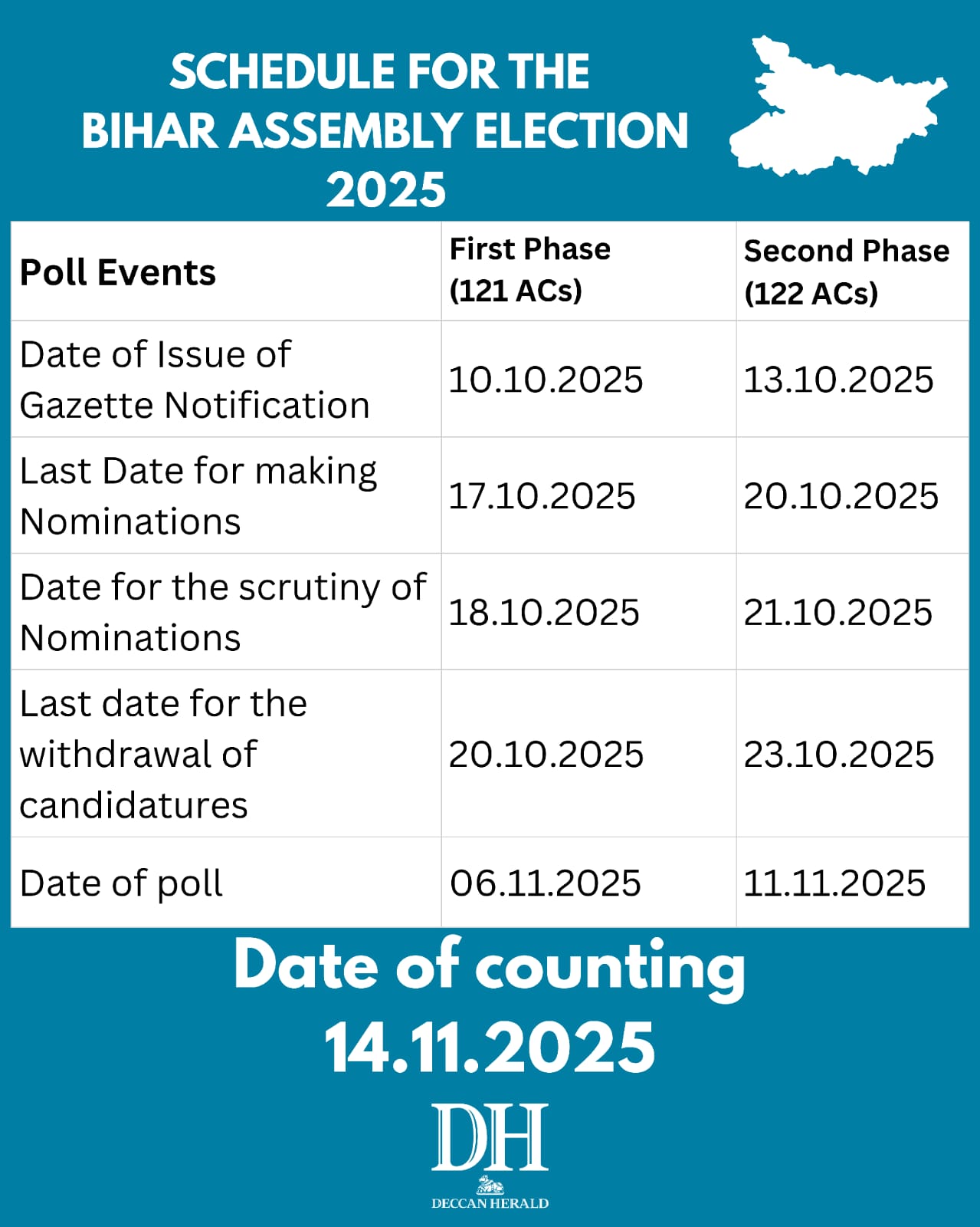 <p>New Delhi: Bihar will vote in two phases on November 6 and 11, in a crucial <a href="https://www.deccanherald.com/tags/bihar-assembly-elections-2025">Assembly election</a> that will decide whether Nitish Kumar-led NDA will retain power or RJD return to helm the government for the first time in 20 years along with its allies. The counting of votes will be on November 14. </p><p>Bypolls to eight Assembly seats, including Budgam and Nagrota in Jammu and Kashmir, will also be held on November 11 along with the second phase of Bihar polls.</p><p>Announcing the schedule, Chief Election Commissioner Gyanesh Kumar told a press conference that the Bihar election is the “mother of all elections” while assuring to hold a peaceful and transparent exercise. </p> .Bihar Assembly Elections 2025 Highlights: Polls in two phases on Nov 6 & 11; counting on Nov 14.<p>In the first phase, 121 seats will go to the polls while voting will be held in 122 assembly constituencies in the second phase.</p><p>The notification for the two phases of Bihar polls will be issued on October 10 and 13. The last date of filing nominations will be October 17 and October 20 with the dates for withdrawal set at October 20 and 23. The elections will be completed before November 16.</p><p>The announcement of the schedule is all set to accelerate seat negotiations within the ruling NDA and the Opposition I.N.D.I.A bloc where smaller parties like CPI(ML)L, VIP, LJP(RV) and HAM are locked in intense bargaining with alliance leaders.</p> .Bihar Assembly Elections 2025: How the state voted in last three polls.<p>The outcome of the election, which is the first after the contentious Special Intensive Revision (SIR) of electoral rolls that brought down the number of voters from 7.89 crore to 7.49 crore, will also determine whether the BJP will finally come out of the shadows of the JD(U).</p><p>It will also test the mettle of election strategist-turned-politician Prashant Kishore’s Jan Suraaj party besides whether the Congress has gained ground after the ‘Voter Adhikar Yatra’ led by Rahul Gandhi. In the coming days, it will also be clear whether Nitish’s son Nishant will enter the poll fray.</p> .<p>The term of the 243-member state assembly ends on November 22. In the 243-member Bihar Assembly, the NDA currently holds 131 seats, with the BJP holding 80, JD(U) 45, HAM(S) 4, and two Independents.</p><p>Of the 243 seats, 38 are reserved for SCs and two for STs. There are 3.92 crore male and 3.5 crore women voters besides 1,725 transgender electors.</p><p>Asked about holding the polls not in a single phase and just after Chhatt festival on October 28, Kumar said they could not have held the elections before the announced dates as a certain minimum period is required for filing nomination and campaign. The 2020 elections were held in three phases during the Covid-19 pandemic.</p><p>On the new initiatives, Kumar said there will be mandatory VVPAT count for mismatches. He said there will be VVPAT slip counting in each and every case of mismatch between Form 17C and EVM data and wherever mock poll data was not erased.</p><p>Voters can also reach out to their Booth Level Officers by booking a call through ECINet, an EC App, he said. For the first time, he said, there will be one General Observer for each constituency.</p>.<p><strong>Bihar: 'Mother of All Elections'</strong></p><p>Phase 1: Nov 6 </p><p>Phase 2: Nov 11</p><p>Counting of Votes: Nov 14</p><p>Seats: 243 -- Gen 203; SC 38; ST 2</p><p>Voters: 7.42 crore</p><p>Male: 3.92 crore</p><p>Female: 3.5 crore</p><p>Transgenders: 1725</p><p>Disabled: 7.2 lakh</p><p>1st time voters: 14.01 lakh</p><p>20-29 years voters: 1.63 crore</p><p>85+ voters: 4.04 lakh</p><p>100+ voters: 14,000</p><p>POLLING STATIONS: 90712</p><p>Rural: 76801</p><p>Urban: 13911</p><p>Avg Voter Per Polling Station: 818</p><p>Election Officials: 8.5 lakh</p><p>Polling Personnel: 4.53 lakh</p><p>Sector Officers: 9,600</p><p>Micro Observers for Polling: 17,800</p><p>Micro Observers for Counting: 4,800</p><p>Counting Officials: 28,300</p><p>Police Officials: 2.5 lakh</p><p>Anganwadi Sevikas: 90712</p><p><br>BYPOLLS</p><p>* Voting in 8 seats on Nov 11; counting on Nov 14</p><p>-- Budgam and Nagrota (Jammu and Kashmir), Anta (Rajasthan), Ghatsila (Jharkhand), Jubilee Hills (Telangana), Tarn Taran (Punjab), Dampa (Mizoram), Naupada (Odisha)</p>