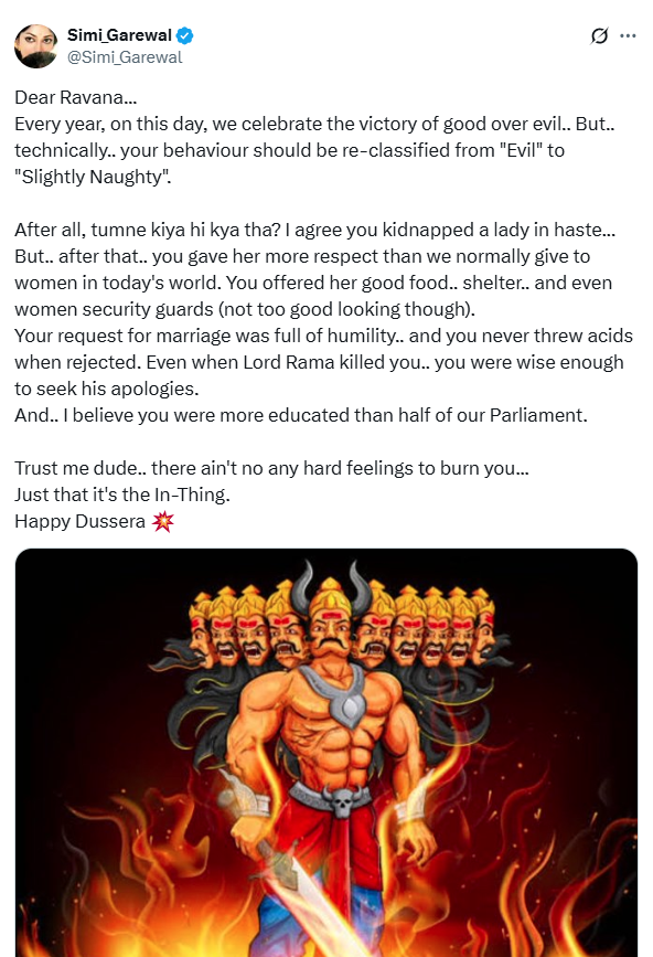 <p>Simi Garewal, renowned for her talk show 'Rendezvous with Simi Garewal' faced a storm on Thursday with an unusual dussehra message. Taking to her X handle, she reimagined the character of Ravan, suggesting he was not truly “evil” but merely “slightly naughty.” </p><p>In her now deleted X post Garewal questioned the traditional vilification of Ravan and said: “Dear Ravana… Every year, on this day, we celebrate the victory of good over evil. But technically, your behaviour should be re-classified from ‘Evil’ to ‘Slightly Naughty.’ After all, tumne kiya hi kya tha?” She praised Ravan for showing Sita respect, offering her shelter and security, and for his humility in requesting marriage. </p><p>Garewal even compared his education to that of contemporary politicians, claiming he was “more educated than half of our Parliament.”</p>.<p>Garewal’s reinterpretation immediately drew sharp criticism following the once celebrated actress deleted her post on X. </p><p>One user tweeted, “Either you have never read the Valmīki Rāmāyaṇa or you are the biggest hypocrite… here you are glorifying Rāvaṇa, a violent serial sexual predator as ‘slightly naughty.’” Another added, “Dear Simi Garewal, the moment he abducts you, all this romanticism will evaporate, and you would be sitting in a police station crying attempt to rape.” </p><p>Dussehra, also known as Vijayadashami, marks the end of Navratri and celebrates Lord Rama’s triumph over Ravan, symbolising the eternal victory of good over evil. Across India, the festival is observed with effigy burning, Ramleela performances, and prayers for justice, wisdom, and strength.</p><p>Garewal, a celebrated actress of the 1960s and 70s, is known for films like <em>Do Badan</em>, <em>Mera Naam Joker</em>, and <em>Karz</em>. </p><p>She cemented her legacy with the talk show 'Rendezvous with Simi Garewal', recognised for its sophisticated interviews with India’s top celebrities.</p>