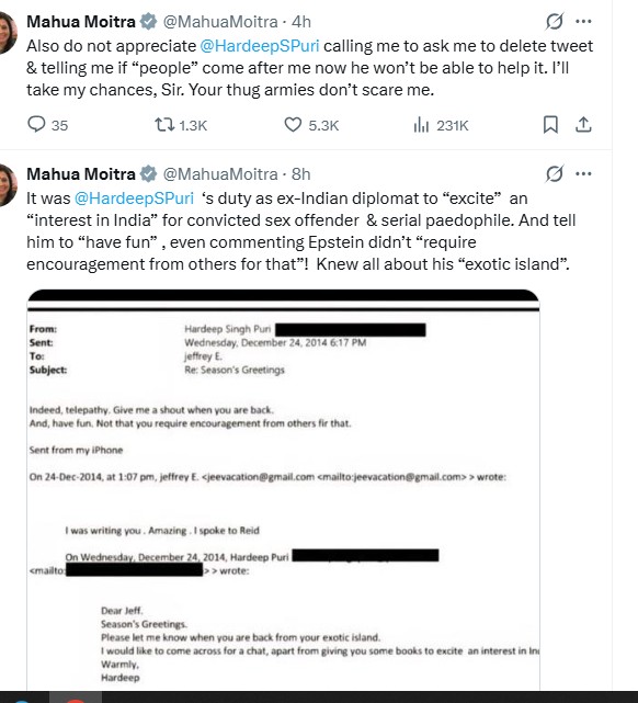 'Asked to delete tweet': Row over Epstein files continues, Mahua Moitra says Hardeep Puri called her over X posts