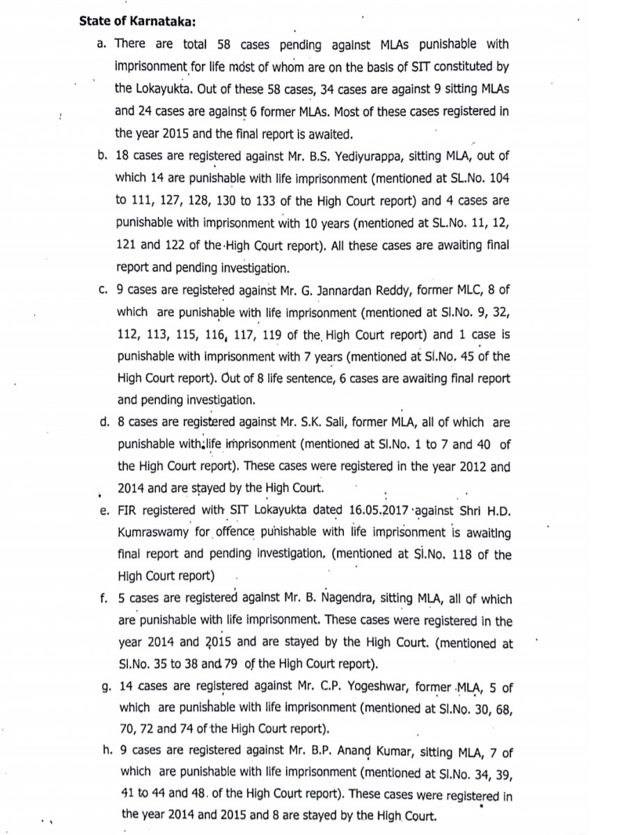 <p>Karnataka Chief Minister H D Kumaraswamy is facing investigation by the Lokayukta SIT for several offences which are punishable with life imprisonment, <a href="https://www.deccanherald.com/national/4122-cases-pending-against-mps-706349.html" target="_blank">a report filed in Supreme Court</a> has stated.</p>.<p>"There are 58 cases pending against MLAs punishable with life imprisonment, most of whom are on the basis of SIT constituted by the Lokayukta. Of these, 34 are pending against nine sitting MLAs and 24 against six former MLAs," senior advocate Vijay Hansaria said in a report filed in the top court as amicus curiae.</p>.<p>Former Chief Minister B S Yeddyurappa, an MLA, is facing investigation in 18 cases, including 14 punishable with life imprisonment and four with a 10-year jail term. "All these cases are pending investigation and awaiting final report," it said.</p>.<p>The report was filed in a PIL filed by advocate and BJP leader Ashwini Kumar Upadhyay.</p>.<p>It said nine cases are pending against former Minister G Janardhana Reddy. Of these, eight are punishable with life imprisonment. As many as 14 cases are pending against former MLA, C P Yogeshwar. Nine cases are pending against sitting MLAs B P Anand Kumar and five against B Nagendra.</p>.<p>In Karnataka, as many as 161 cases are pending against sitting and former legislators.</p>