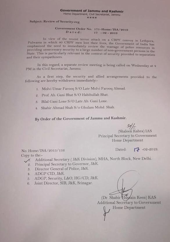 <p class="title">Two days after Union Home Minister Rajnath Singh said that he has asked the officers to review the security provided to people taking money from Pakistan and its spy agency ISI, Jammu and Kashmir government on Sunday withdrew security of five separatist leaders.<br /> <br />Officials said orders for withdrawing the security cover of five separatist leaders – Mirwaiz Umar Farooq, Abdul Gani Bhat, Bilal Lone, Hashim Qureshi and Shabir Shah was issued by the state Home department.<br /> <br />“Security and vehicles provided to these five separatist leaders will stand withdrawn by Sunday evening. No security forces or cover will be provided, under any pretext, to them or any other separatists. If they have any other facilities provided by the government, they are to be withdrawn forthwith,” the order reads.</p>.<p class="title"><strong>READ: <a href="https://www.deccanherald.com/national/had-never-asked-security-hurriyat-leaders-718929.html" target="_blank">Never asked for security: Hurriyat leaders react</a></strong></p>.<p class="title"> <br />Police will also review if there are any other separatists, who have security or facilities which will be withdrawn immediately, the officials said. </p>.<p class="title"><br /> <br />Besides heading the moderate faction of the Hurriyat, the Mirwaiz is also the chief priest of Kashmir and enjoys Z-category security for the last more than two decades. His father Mirwaiz Farooq was killed by militants on 21 May 1990 and since then the Mirwaiz family was being provided with the security by the government.<br /> <br />He had eight to ten security guards for his protection until the lynching of a deputy superintendent of police Mohammad Ayoub at Jamia Masjid, Nowhatta, Srinagar, in June 2017. “After the lynching incident, the security cover of Mirwaiz was trimmed to six PSOs,” a source said.<br /> <br />Bilal Lone, a senior leader of moderate Hurriyat, is the son separatist leader Abdul Gani Lone, who was assassinated on 21 May 2002. His brother Sajjad Lone was a minister in erstwhile PDP-BJP alliance in the state. Prof Bhat is also a senior leader of moderate Hurriyat while Shabir Shah, who heads his own organisation, is currently lodged in Tihar Jail on the charges of receiving hawala money for terror and stone pelting activities.<br /> <br />On Friday, the union home minister told journalists in Srinagar that there were some people in Kashmir who were “taking money from Pakistan and ISI” and that he has directed the state administration to “review the security of such people”.<br />A police officer, wishing not to be named, said the exercise was carried out on the directions of union home minister.<br /> <br />In June 2016, a BJP legislator Ajat Shatru Singh had claimed that Central and State governments had spent a whopping Rs 560 crore on separatists from 2011-2016.<br /> <br />Speaking in the Legislative Council, he said that government provided more than 950 personal security officers to people who seek ‘Azadi’ from India. He had also claimed that government of India was paying all the travel and hotel expenses of separatists outside J&K.<br /> <br />“From hotel to food to air tickets everything is being paid by the government of India, while separatists, holiday outside the state. On an average the government spends around Rs 100 crore on separatists every year,” he had said.<br /> <br />Hurriyat hawk Syed Ali Geelani and pro-independence JKLF chief Yasin Malik are the two senior most separatist leaders, who had not accepted the security provided by the state government to the separatists in late 1990’s and early 2000’s. The security cover was provided to the separatists after the killing of Abdul Gani Lone and attacks on several of them by unidentified militants.</p>