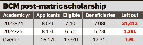 <p>Dharwad: As many as 1.6 lakh eligible students haven’t received the Karnataka government’s post-matric scholarship for backward classes and minority communities in the last two academic years, with several students expressing fear that the prolonged delay could force them to discontinue their studies. </p>.<p>According to government data, overall 16.17 lakh students applied for the Backward Classes and Minority (BCM) scholarship in the 2023-24 and 2024-25 academic years. While 13.91 lakh applicants were found eligible, 12.31 lakh of them received the amount, leaving out around 1.6 lakh students. </p>.<p>Among them, the scholarship of 31,413 students have been pending for the academic years 2023-24, 2024-25 and 2025-26. Another 1.28 lakh students haven’t received the same scholarship for the years 2024-25 and 2025-26. </p>.<p>For the 2025-26 academic year, 5.18 lakh students have applied for the scholarship till December. The scrutiny of these applications is yet to be completed. </p>.<p>Beneficiaries of the scholarship include students pursuing PUC, degree and PG courses across the state. </p>.Bridging governance and scholarship.<p>The Backward Classes Welfare Department said the Finance Department was yet to release funds for disbursing the scholarships.</p>.<p>Under the post-matric BCM scholarship, the government provides Rs 15,000 per year to each eligible student. Those belonging to nomadic and semi-nomadic communities are eligible for an additional Rs 4,000.</p>.<p>For 2023–24, as many as 8.04 lakh students had applied for scholarship. After scrutiny, 7.4 lakh were declared eligible.</p>.<p>While 7.08 lakh students received amount, 31,413 students were left out.</p>.<p>The number of applicants increased in 2024–25, to 8.13 lakh. Of these, 6.51 lakh students were declared eligible, but only 5.23 lakh received scholarship amount. As many as 1.28 lakh students are awaiting disbursal.</p>.<p>“I applied when I joined, I am now in my third year and have not received it even once,” said Chitra from Dharwad.</p>.<p>Recently, students of College of Agriculture in Dharwad staged a protest for scholarships. Sanat Totiger, president of Students’ Association, University of Agricultural Sciences, Dharwad, told DH that scholarships had not been released for past 2 years.</p>.<p>Totiger said earlier, OBC and minority students received Rs 38,000 as scholarship, covering nearly 50% of college fees. Adding to students’ woes, Totiger said, the government reduced amount to Rs 15,000 from 2024, even as college and hostel fees increased to nearly Rs 1.25 lakh.</p>.<p>Another student, Mahadev, said he visited BCW department more than 10 times, but to no avail.</p>.<p>Acknowledging the delay, Backward Classes Welfare Minister Shivaraj Tangadagi said the department would soon disburse pending scholarships.</p>.<p>BCW commissioner Dayanand K A stated the finance department had given approval for the proposal seeking funds for disbursement of scholarships a couple of days ago and the process to clear dues is underway. </p>
