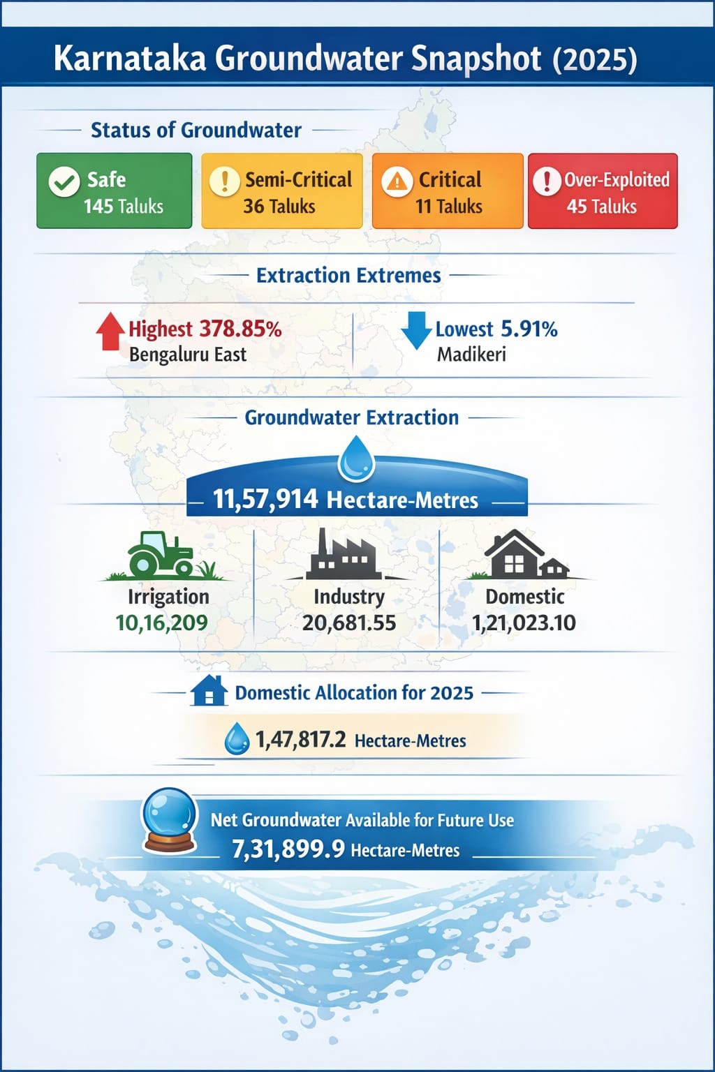 <p>Bengaluru: While <a href="https://www.deccanherald.com/india/karnataka">Karnataka </a>has seen an overall decline in groundwater extraction, the entire Bengaluru area remains ‘over-exploited’ and sub-surface water in 86 taluks is contaminated, a government report released Wednesday said. </p><p>Overall groundwater extraction has reduced from 68.44% in 2024 to 66.49%, the Dynamic Ground Water Resources of Karnataka 2025 report said.</p> .Karnataka's groundwater usage depletes, recharge capacity up: Report.<p>The annual groundwater recharge capacity has marginally risen from 18.74 billion cubic metres (BCM) in 2024 to 19.28 BCM in 2025. Also, annual extractable groundwater resources rose from 16.88 BCM to 17.41 BCM. </p><p>“These gains are the result of good rainfall, focussed policy interventions and large-scale water conservation initiatives,” Minor Irrigation Minister NS Boseraju said after releasing the report. </p>.<p>However, all taluks in the Bengaluru Urban district remain in the ‘over-exploited’ category. </p><p>The groundwater status in 11 taluks -- Athani (Belagavi), Channapatna (Bengaluru South), Chamarajanagar, Molkalmur (Chitradurga), Davangere, Ron (Gadag), Channarayapatna (Hassan), Ranebennur, Savanur, Shiggaon (all Haveri) and Afzalpur (Kalaburagi) -- have improved.</p><p>In six taluks, the situation has deteriorated: Magadi (Bengaluru South), Kamalanagar (Bidar), Laxmeshwar (Gadag), Aland (Kalaburagi), Chadchan and Indi (both Vijayapura). </p><p>Groundwater extraction ranges from 5.91% in Madikeri (Kodagu) to a staggering 378.85% in Bengaluru East, the report shows. District-wise extraction ranges from 25.44% in Ballari to 184.43% in Kolar. </p><p>The report also notes a small decline in groundwater extraction for domestic use thanks to the Jal Jeevan Mission (JJM). </p> .<p><strong>Contamination</strong></p><p>Nitrate is the highest contaminant of groundwater in 41 taluks, which includes Bengaluru North and Yelahanka, the report shows. There is high salinity in 17 taluks, fluoride in 15 taluks and uranium in 13 taluks. </p> .<p><strong>AI-based surveillance</strong></p><p>Boseraju said the government will soon initiate AI-based satellite surveillance for real-time data for continuous groundwater monitoring. This will be under the Digital Water Stack (DWS) initiative, the minister said. </p><p>“Instead of depending solely on the 120-day monsoon, we’re ensuring water availability across all 365 days through scientific management. This has strengthened long-term water security for both farmers and urban residents," he claimed. </p>