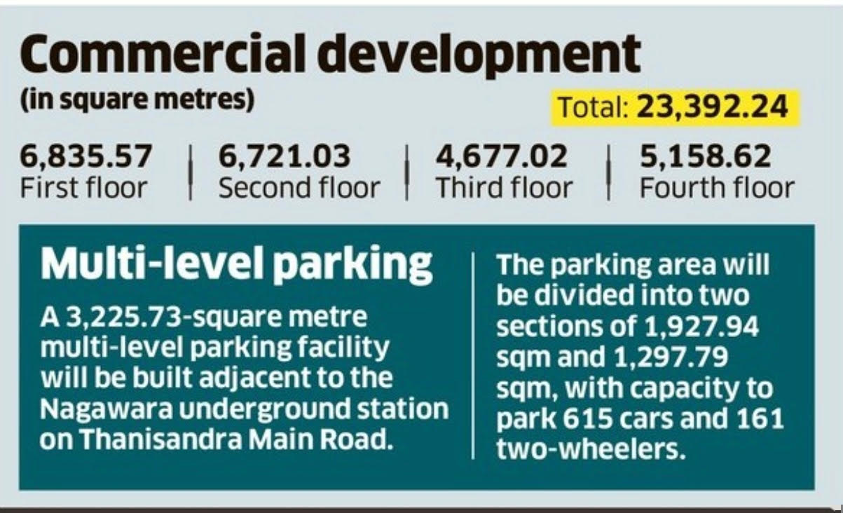 <p>Bengaluru: A four-storey commercial complex spread over nearly six acres is set to rise above the Nagawara metro station on the Pink Line in northeastern Bengaluru. </p>.<p>A multi-level parking facility covering 3,225.73 square metres will also come up next to the underground station. </p>.<p>On Friday, Bangalore Metro Rail Corporation Limited (BMRCL) invited Expressions of Interest (EoI) from reputable developers, corporate firms, co-working operators, and retail or mall chains to develop 23,392.24 square metres (5.7 acres) of built-up area across four floors at the Nagawara metro station. </p>.<p>The first two floors have been structurally completed with columns, beams and slabs (side walls are pending), while the remaining two floors will be completed in 8-10 months, the BMRCL stated. </p>.Greater Bengaluru Authority engineers undergo training ahead of major road works .<p>The space is suitable for Grade ‘A’ offices, co-working hubs or premium shopping malls, with scope for incorporating dedicated lifts and escalators from the concourse and platform levels of the metro station, it added. </p>.<p>The station, expected to open by December 2026, is close to Embassy Manyata Business Park, Karle Town Centre and other tech centres. </p>.<p>Nagawara will also offer airport connectivity through an elevated station on the Blue Line, which is slated to open by December 2027. The elevated station is being built above the Outer Ring Road (ORR) flyover, and both stations’ concourses will be directly connected. </p>.<p>A senior BMRCL official said the EoI aimed to gather inputs from industry leaders, and a Request for Proposal (RFP) would be invited later. </p>.<p>The BMRCL will evaluate all EoIs and, based on the concepts and feedback received, may finalise the development model and issue a formal tender. The tender will incorporate relevant features from the EoI process to align with market expectations and long-term viability, it added. </p>.<p>The last date to submit EoIs is December 15. </p>.<p>This is the third property development project announced by the BMRCL this year. </p>.<p>The corporation has already planned an 11-storey commercial building with basement parking on a 1.66-acre parcel near the KR Puram metro station. At Majestic, it plans to develop over one million square metres of commercial space and its largest parking facility on a 31,920-sqm site above the metro station. </p>.<p>Property development is part of the BMRCL’s strategy to increase non-fare revenue to about 15% of its farebox revenue. </p>