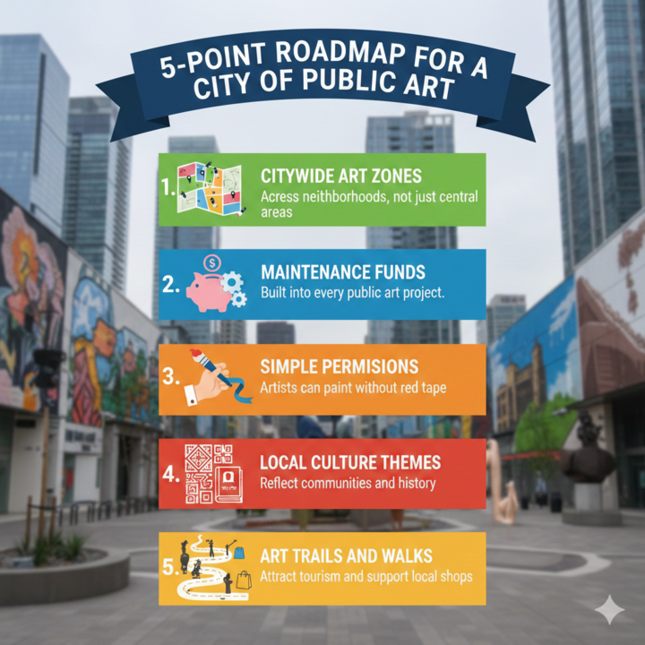 <p>The boy pulled his mother’s hand on Church Street not towards a toy shop or cafe, but toward a painted wall. He stood there staring at a giant face splashed in colours as if it might speak to him. People slowed down, strangers smiled at each other, phones came out. For a brief moment, the street felt like a gallery without doors. That is what public art does, it turns passing into pausing and roads into shared rooms.</p>.<p>Public art means art placed in open spaces, on streets, flyovers, metro stations, parks and market walls, free for everyone to see.</p>.<p>It does not ask for a ticket. It does not ask who you are. In a city of concrete and glass towers, dangling cables and steel columns, it is one of the few things that belongs to all.</p>.<p>In Bengaluru, this idea is not new. The Malleswaram wall art project once turned quiet lanes into an open gallery. Murals celebrated local community and daily life. </p>.<p>But over time, the paint faded. Some walls were repainted and there was no clear maintenance plan. What started strong slowly became a memory.</p>.<p>A similar story unfolded on Church Street. During festivals and city events, murals bloomed across shutters and side lanes. Today, the wall art on Church Street still attracts visitors who stop for photos.</p>.Nothing opens its first-ever India flagship store in Bengaluru.<p>Poornima Sukumar, project director of the city’s popular art collective Aravani Art Project, told DH that an artwork can “represent a city’s past, present and future, not just through paintings”.</p>.<p>She said continuity is difficult because projects must be recommissioned and funded again. Clearer, easier permissions from authorities would encourage more people to step forward and create art, Poornima added. </p>.<p>A daily wage worker, a software engineer, a street vendor and a school child can all stand before the same mural. It creates a common ground. In some projects, diverse communities have not just watched, but taken part.</p>.<p>Collectives like Jaaga and the Aravani Art Project have involved local residents, queer communities, students and volunteers in painting walls together. </p>.<p>In 2012, Urban Avantgarde, organised by the Goethe Institut with Jaaga and the state government, brought German street artists to collaborate with local artists to create murals and wall art in the city. It was followed by many such collaborations. But the momentum did not last. </p>.<p>The future of public art in Bengaluru depends on policy, participation and patience. Urban expert Ashwin Mahesh stressed the need for stronger systems, saying, “The Bangalore Urban Arts Commission must be reconstituted. Such a body made up of artists, architects and planners, is essential to preserve city aesthetics and heritage. Painting pillars is important, but that alone will not elevate the city’s aesthetics”.</p>.<p>Bengaluru has also seen sculptures by renowned artist Yusuf Arakkal placed in public areas along with temporary installations in parks and art at metro stations. Despite these examples, there was no sustained citywide plan to carry the momentum forward. </p>.<p>Urban expert V Ravichandar told DH that public art “enriches a neighbourhood”, but pointed out that getting permissions from multiple authorities often hinders and discourages people from taking up such projects.</p>.<p>He urged GBA to make clearances easier and suggested creating "20 to 30 designated locations, not just in central business district (CBD),” where artworks could be displayed for a few months and then rotated to give others opportunities.</p>.<p>Ravichandar said a framework and progressive policy is “the need of the hour” to enable artworks, noting Bengaluru has immense potential and that private players are willing to fund projects if approvals are streamlined.</p>.<p>Why do these efforts end so soon? Artists point to funding gaps. Public art cannot survive on one-time enthusiasm. It needs a budget line, a maintenance contract and local ownership. </p>.<p>Globally, cities show how this works. In Georgetown (Malaysia), street art has created tourism trails that draw international visitors. In Berlin, the East Side Gallery has turned a historic wall into an open air gallery. Murals there are not merely decorations, but destinations too. </p>