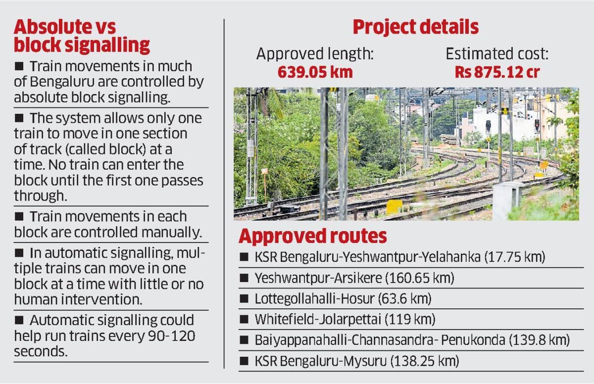 Presently, train movements in much of Bengaluru (and Karnataka) are controlled by the absolute block signalling system, which allows only one train to move in one section of track (or block) at a time.