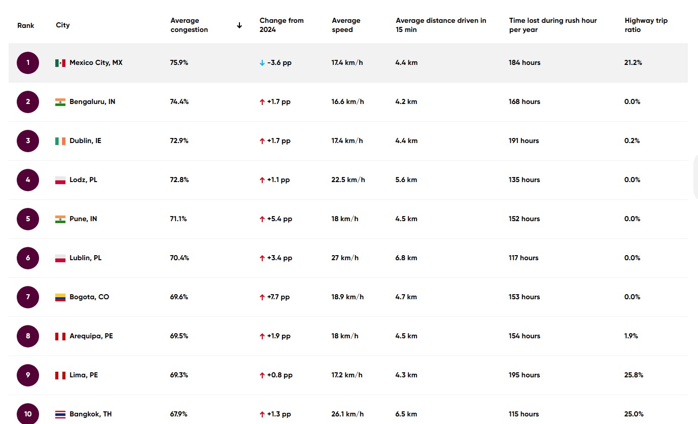 <p>Bengaluru has made headlines for its <a href="https://www.deccanherald.com/search?q=traffic">traffic </a>yet again as it is ranked second for the world's most congested cities on the Tom Tom Traffic Index 2025. </p><p>The <a href="https://www.deccanherald.com/search?q=Bengaluru">'Silicon City</a>' reported an average congestion level of 74.4 per cent, up 1.7 percentage points from 2024.</p><p>It took an average of 36 minutes and 9 seconds to travel 10 km within the city, a rise of 2 minutes and four seconds from the previous year. </p>.Bengaluru Traffic Police to launch verification stickers to curb unauthorised autorickshaws.<p>Bengalureans lost 168 hours and 40 minutes, or seven days in the year in rush hour traffic. This figure is 12 hours 46 minutes more than in 2024.</p><p>With such jarring statistics derived from anonymous trip data covering 3.65 trillion km of driving worldwide, Bengaluru ranks only behind the Mexico City. </p><p>Pune is the other Indian city in the top 5, while Ireland's Dublin and Lodz in Poland occupy the third and fourth ranks, respectively. </p><p><strong>Rush hours</strong></p><p>Bengaluru's traffic worsens during the morning rush hour, which was not defined by the Dutch agency, with a 10 km drive taking 41 minutes and 6 seconds. The average congestion level is at 94.2 per cent and the 14.6 km/h during this time.</p><p>It seems to get worse during the evening rush hour with people taking an average of 45 minutes and 27 seconds to cover a stretch of 10 km. The average congestion during this period is 115.2 per cent and the average speed reported is 13.2 km/h. </p>.Bengaluru: 5K run for road safety awareness on Feb 1.<p>Short trips are no exceptions. In 15 minutes, the average distance covered in Bengaluru is 4.2 km, which is 0.2 km less than the previous year. </p><p><strong>Worst day: May 17, 2025</strong></p><p>TomTom says that May 17, 2025, a Saturday was the worst commuting day in the city with average congestion at 101 per cent. </p><h3><strong>World's top 10: </strong></h3>.<p><strong>Multiple Indian cities in top 50</strong></p><p>The TomTom ranking shows congestion is not limited to Bengaluru, with several Indian cities appearing across the list.</p><p>2. Bengaluru: 74.4 per cent congestion<br>5. Pune:71.1 per cent<br>18. Mumbai: 63.2 per cent<br>23. New Delhi: 60.2 per cent<br>29. Kolkata: 58.9 per cent<br>30. Jaipur: 58.7 per cent<br>32. Chennai: 58.6 per cent 47. Hyderabad: 55.5 per cent</p><p>TomTom is a Netherlands-based location technology company best known for its digital maps, navigation software and real-time traffic services. </p><p>The agency publishes the annual Traffic Index to compare congestion levels and travel times across cities worldwide.</p>
