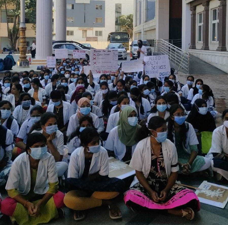 <p>Bengaluru: Around 250 students of the BSc Allied Health Sciences (AHS) at the <a href="https://www.deccanherald.com/india/karnataka/bengaluru">Bangalore </a>Medical College and Research Institute (BMCRI) intensified their protest on Thursday, moving their demonstration to the Victoria Hospital campus. The students, who began an indefinite strike on Wednesday, are demanding the immediate implementation of stipends for their compulsory one-year internship and the provision of basic <a href="https://www.deccanherald.com/education">academic </a>infrastructure.<br><br>The protesting interns, including lab technicians, optometrists, and radiology assistants, alleged that despite working 8 to 12-hour shifts often under heavy clinical loads, they have not received any financial compensation This is in contrast to their counterparts at other government-run institutions like the Kidwai Memorial Institute of Oncology and the Jayadeva Institute, who receive monthly stipends ranging from Rs 7,000 to Rs 15,000.</p>.<p><br>The students claimed that their repeated appeals to the college administration and the state government have been met with the same response: that the stipend is a "policy decision" awaiting government funds.<br><br>"We are forced to perform full-time clinical duties and night shifts without any pay. Many of us are denied government hostel facilities and are struggling to afford private accommodation in the city," a protesting student, told DH.</p>.Karnataka govt to set up residential school for children suffering from cancer near Kidwai.<p>Beyond this, the students highlighted a chronic lack of facilities. The AHS department reportedly lacks a dedicated building and permanent faculty. Classes are often conducted by medical postgraduate (PG) students, who, the protesters claim, are also not compensated for this additional teaching responsibility.<br><br>The All India Students’ Association (AISA), which has extended support to the strike, stated that the students would continue to boycott classes and internship duties until a concrete timeline for the stipend implementation is provided.<br><br>As the strike enters its third day, healthcare services at Victoria Hospital where interns provide essential support under supervision could see a visible impact if the protest continues.<br><br><strong>Key demands<br></strong><br>Immediate implementation of a monthly stipend for the 3+1 internship year (interns currently work 8 to 12 hour shifts unpaid).<br><br>Provision of a dedicated academic building for Allied Health Sciences (AHS).<br><br>Appointment of permanent, qualified faculty for AHS instead of relying solely on Medical PG students.<br><br>Provision of government hostel facilities for interns who are currently forced to stay in expensive private accommodations.</p>