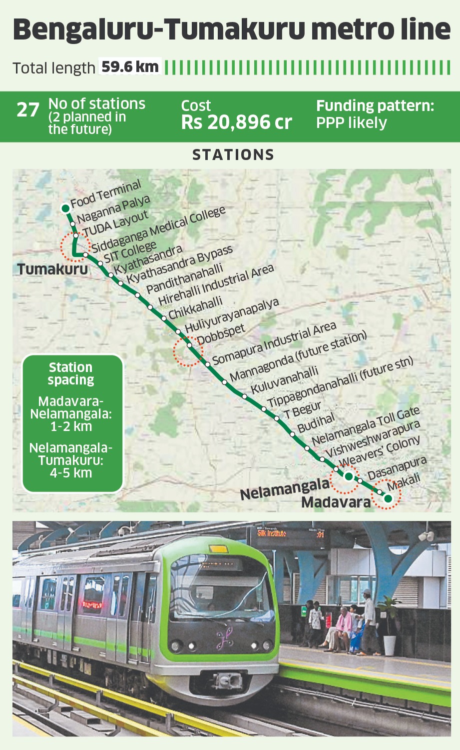 <p>Bengaluru: Setting the ball rolling for building a mass rapid transit system between Bengaluru and Tumakuru, <a href="https://www.deccanherald.com/tags/namma-metro">Namma Metro</a> on Sunday floated tenders for preparing the Detailed Project Report (DPR) for the 59.6-km corridor starting at Madavara.</p><p>This line is estimated to cost Rs 20,896 crore with 27 stations, including two planned for the future.</p>.<p>According to Bangalore Metro Rail Corporation Limited (BMRCL), the Madavara-Nelamangala section will have stations spaced 1-2 km apart, while the stretch from Nelamangala to Tumakuru may get a station every 4-5 km.</p><p>Given the high cost, the project may be taken up by PPP, BOT, DFBOT, DBFOT or the Developer Finance Model.</p>.Metro Phase 3: Bengaluru's longest double-decker to have 5 ramps, loops in 9 areas for local traffic.<p>The Tumkuru corridor is one of the five extensions and three new lines proposed under Namma Metro's 210.9-km Phase 4, mainly aimed at connecting the city's core to the periphery.</p><p>The BMRCL is going ahead with the DPR preparation after the state government accepted the Feasibility Study Report on the Madavara-Tumakuru metro line earlier this year.</p><p>The BMRCL has given bidders just a week to submit the Requests for Proposal (RFPs) and will open the bids on November 21. Bidders will have five months from the award of the Letter of Acceptance (LoA) to prepare the DPR.</p><p>The consultant will have to explore the most reasonable and feasible Mass Rapid Transit (MRT) system, evaluating mobility, conceptual engineering, environmental and social assessment, cost effectiveness and affordability, and financial and economic aspects. A key aspect of the DPR should be integration with existing and planned metro rail corridors as well as bus terminals and railway stations.</p><p>It will also suggest whether the line should be elevated, underground or at-grade.</p><p>The consultant will undertake geotechnical investigations along the corridor and the depot location, topography, traffic and transportation surveys, future travel demand and ridership assessment.</p>.What ails Namma Metro, Bengaluru's long-promised lifeline?.<p>The project has received criticism since it was first mooted by Home Minister and Tumakuru district in-charge minister G Parameshwara nearly two years ago.</p><p>Critics say a metro is better suited for intra-city travel while a suburban railway or Rail Rapid Transit System (RRTS) line is better for inter-city connectivity.</p><p>Namma Metro's average operating speed is 34 kmph, meaning the 60-km distance will take nearly two hours, the same as a bus or train.</p><p>The South Western Railway (SWR) plans to quadruple the Bengaluru-Tumakuru line at a cost of Rs 3,500 crore. Railway Infrastructure Development Company Karnataka (K-RIDE) has proposed a suburban line to Tumakuru. Recently, the National Capital Region Transport Corporation (NCRTC) showed interest in preparing DPRs for RRTS corridors between Bengaluru and four cities, including Tumakuru. However, all these projects are still in the conceptual stage.</p><p>A senior BMRCL official, speaking on the condition of anonymity, indicated the Ministry of Housing and Urban Affairs (MoHUA) is unlikely to approve the Tumakuru line unless it is taken up under a PPP model.</p><p>Another official noted that clarity on funding will come only after the DPR is finalised, approved by Karnataka and sent to the ministry. The process could take up to two years. </p>