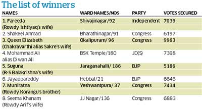 <p>Despite, rubbing the sitting MLAs on the wrong side, a few managed to win, contesting as independents while others enforced their charisma in their old pockets and made it.<br />Mohammed Ali alias Diwan Ali played his minority card to its best and won the elections with a comfortable margin from (Ward no 180) Banshankari temple on a JD(S) ticket. <br />A CCB police officer who recalled: "Sitting inside the jail, he kept a close watch on the BBMP polls and when the matter was in the court he intelligently managed to come out on parole, confirmed his ticket and went back to jail. Finally, he moved his bail application, weeks before the elections, contested the polls and won."<br /><br />‘False cases’<br />Minutes after meeting former chief minister H D Kumarswamy, Deccan Herald caught up with Diwan Ali. “If I am a ‘bad’ man, why did the people choose me. They elected me with a thumping majority. Many politicians are jealous of my popularity and probably they pressurised the police who in turn charged false cases against me.”<br />Kumaranna was happy and “he advised me to continue the good work and not to get involved in any mess. I am a social worker and from the time I came out of the jail, a team of policemen are with me round the clock. They are witness to how I won this election,” said Diwan Ali. <br /><br />Meanwhile, Ishtiyaq Ahmed alias Ishtiyaq Pilvan and Chakravarthy alias Sakre’s wife also won the polls. Ishtiyaq commented on his wife’s victory: "Enough of shouting at the top of their voices, tarnishing the image and branding me as 'rowdy sheeter'. Now, the same people have voted and elected my wife (Fareeda) as the corporator of Shivajinagar ward no 92. Stop looking at us with evil eyes, we are social workers and it is for our 'good' work that we have been noticed and we are picked up by the people.” <br /><br />“It is their trust and their blessings my wife has been voted to power,” Ishtiyaq added.<br />He added, “If someone raises his voice and gets the work done, they are branded as rowdies which continues for rest of their lives and automatically goes into the rowdy sheeter. Now, I will work for the betterment of the people, let me see whether they will 'delete' my name from the rowdy sheeter list.”<br /><br />Interestingly the wives of two rowdies were pitted against each other in ward no 96 Okalipuram --- Chakravarthy alias Sakre's wife Queen Elizabeth who contested on a Congress ticket while Nagaraja alias Bomb Naga's wife Pushpalatha as independent. However, Sakre's wife won hands down with 9,963 votes. <br /><br />Sakre told Deccan Herald: “Yes, it was an accident and I happened to enter that mad world, I have regretted enough and now, I begged for a chance to come out clean. Thanks to the Congress party for recognising my work. People from my area know my worth and selected my wife. I will continue to do the good work. For the last 15 years, I have not got into any unwanted work and will continue to remain a clean man.”<br />When asked about Bomb Naga, Sakre said: "He is still a 'kid' and there was no problem at all. It was a cake walk. We will work hard and retain the seat in the coming elections also.”<br /><br />However, Bomb Naga who contested from Ward no 98 Prakash Nagar lost the battle.<br />On the other hand, not all candidates with criminal background had a good time. A host of them had to be content with just double digits, where only their associates voted for them.<br />DH News Service<br /><br /></p>