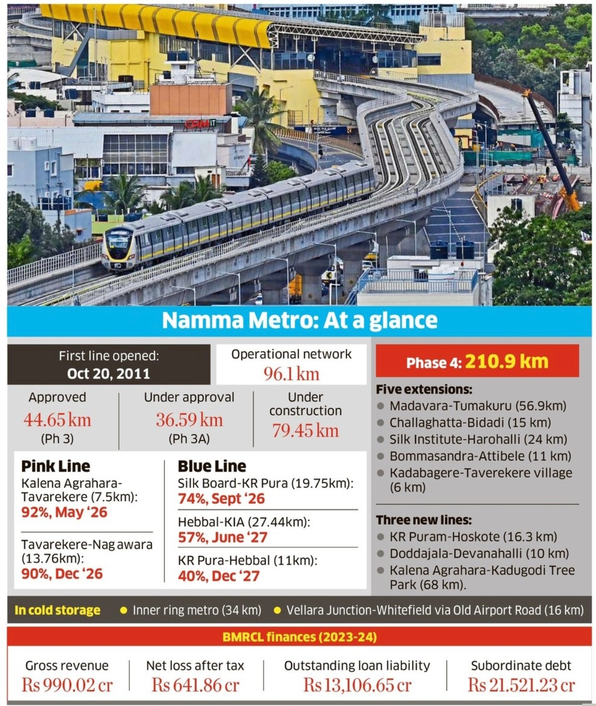 <p>Bengaluru: When the first metro train chugged into the MG Road station on October 20, 2011, Bengalureans rejoiced with childlike excitement. </p>.<p>It was the city’s first metro corridor — a 6.7-km section of the Purple Line from MG Road to Baiyappanahalli — and citizens were convinced that a reliable and affordable solution to Bengaluru’s notorious traffic woes had finally arrived.</p>.<p>They believed that the city would expand the metro fast enough — within 10-15 years — to cover all major areas. The excitement was pure, the hope infectious. </p>.<p>But 14 years on, the excitement has ebbed, the hope dimmed. As construction slows and expansion drags, citizens wonder what’s really ailing Namma Metro? Why has the proposed panacea failed to ease traffic woes? </p>.<p>The first Delhi Metro line opened on December 24, 2002. By the 14th anniversary, the city had built more than 200 km of the network, including the airport line. </p>.<p>In contrast, Bengaluru’s metro network has not crossed 100 km even after 14 years.</p>.<p>And instead of expanding the network within the city, Bengaluru Metro is going to the outskirts. </p>.<p>With an acute shortage of trains, Bengaluru Metro’s busiest stations resemble Mumbai’s crowded local train stations. Train frequency is below par, operations start late on Sundays and fares are high. </p>.<p>The deeper malaise lies within the institution itself. Namma Metro gets a new managing director every two years, doesn’t have its own head office and is struggling to attract and retain technically qualified people. </p>.<p>“In the initial years, what we needed was a strong foundation to guide future progress, but that was never laid. It began as an ad hoc system with retired people at the helm of affairs, and it still is,” says a person in the know. </p>.<p>Hiring woes</p>.<p>Experienced engineers from the railways and other professionals from other metros hesitate to come here because the pay is substantially lower, there is no regular employment, contracts are shorter (1-3 years against five years). Hence, BMRCL is heavily dependent on retired employees, some working even beyond 70 years. </p>.<p>Such service conditions undermine continuity for a project that typically takes at least five years. </p>.<p>In 2023-24, the BMRCL had 2,313 employees, nearly half of them hired on contract.</p>.<p>“We’re also facing a shortage of train operators,” a second person says. </p>.<p>Rented head office</p>.<p>Despite having sufficient land, BMRCL still functions out of a rented office atop the BMTC bus station in Shanthinagar, paying Rs 8 crore - Rs 9 crore annually.</p>.<p>“Chennai Metro has built a swanky, nine-storey building of its own, complete with an adjacent township. Even smaller metro railway companies like Lucknow, Kochi, Nagpur, etc, have their own head offices,” the person adds. </p>.<p>Network expansion</p>.<p>The second person explains how political pressure is dictating new lines. “Delhi Metro relies on its Comprehensive Mobility Plan (CMP) for expansion and seeks the government’s permission to make Detailed Project Reports (DPRs). But in Bengaluru, it’s the political leaders who decide where the metro should expand.” </p>.<p>And instead of preparing the DPR for 100-200 km, Bengaluru metro has traditionally proposed only 30-40 km, leading to piecemeal approvals. </p>.<p>According to the person, the thumb rule is to first expand within the city centre, build a circular line and increase interchange stations. </p>.<p>“That’s how you get ridership. Look at what happened with the RV Road interchange station. Our ridership increased by 2.5 lakh. Delhi Metro did the same, with dozens of interchange stations. Its daily ridership is 70 lakh”. </p>.Is Pink the new Yellow for Bengaluru's Namma Metro? Equipment shortage hits train supply.<p>The CMP prepared by the Department of Urban Land Transport (DULT) suggested two new lines within the city. An inner ring metro with 22 stations and another line connecting Vellara Junction and Whitefield via Old Airport Road. “We aren’t studying the feasibility of either line,” a third person confirmed. </p>.<p>Key positions vacant</p>.<p>The BMRCL has been without two key directors. The Director (Operations and Maintenance) superannuated in February, while the Director (Project and Planning) retired in May. </p>.<p>In June, BMRCL invited applications to fill both positions. But even after five months, no interviews have been conducted, the people say. “Both appointments have to be cleared by the ministry,” one of them said. </p>.<p>The cost of slow construction</p>.<p>Slow construction not only leads to cost overruns, but also holds up revenue generation. A year’s delay escalates the cost by a minimum of 5%. </p>.<p>The cost of Phase 2 (75.06 km) has increased from Rs 30,695 crore to Rs 40,614.27 crore and its new deadline is December 2026, a six-year delay from the original target. </p>.<p>Phase 2A/2B will also likely see cost escalation. Its deadline has been revised, from June 2026 to December 2027. Phase 3, okayed by the Centre in June 2025, has yet to see groundwork. Even before tenders are called, its deadline has been revised by a year to 2031. </p>.<p>Financial pressures</p>.<p>Operational inefficiencies have compounded financial pressures. </p>.<p>With the state not keen to continue shadow cash support, BMRCL increased the fares in February 2025, by an average of 51.55% before discounts and 46.39% after discounts. It also plans to increase the fares by up to 5% every year, starting February 2026. </p>.<p>The Karnataka High Court’s November 3, 2025, judgement that the Centre has “pervasive control” over Namma Metro and the state “plays second fiddle” may further complicate matters. </p>.<p>Fourteen years after that jubilant first ride, Bengaluru’s metro dream stands at a crossroads. Whether it can regain public trust will depend as much on new line