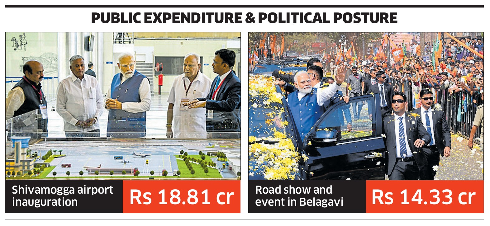 <p>Bengaluru: Three months ahead of the 2023 Assembly elections in <a href="https://www.deccanherald.com/india/karnataka">Karnataka</a>, the BJP government spent about Rs 33 crore on two events headlined by Prime Minister <a href="https://www.deccanherald.com/tags/narendra-modi">Narendra Modi</a>, with over Rs 6.5 crore spent just to ferry people to the events.</p><p>Documents accessed under the RTI after a three-year struggle by Manjunath Hirechowti of Lanchamukta Karnataka show that the expenditure for the inauguration of the Shivamogga airport on February 27, 2023, where Modi asked people to “vote for a double-engine government in future too”, stood at Rs 18.81 crore.</p><p>The expenses include 1,800 buses hired at a cost of Rs 4.11 crore to bring people from various places for Modi’s event. Over Rs 1.8 crore was spent for two heads of works: waterproof German structure truss pandal for the main stage dais and green room, model presentation stalls and flower decoration for the Prime Minister, the Governor, the Chief Minister and others.</p>. <p>The documents also showed that the Public Works Department had obtained exemption under section 4(G) of the Karnataka Transparency in Public Procurement (KTPP) Act.</p><p>Hours later, Modi flew to Belagavi by a special flight from Shivamogga and took a chopper to the ground from where he commenced a roadshow at about 2.45 pm. While the air travel expenses were unavailable, another set of documents obtained under RTI Act showed that the Public Works Department received approval of the government to spend Rs 14.35 crore, including Rs 2.5 crore towards buses to carry people to the programme.</p>.'Rs 2 crore spent on samosa during PM Modi's event in Gujarat': Kejriwal slams BJP citing RTI response.<p>Hirechowti filed the RTI application for the Shivamogga event’s expenditure in March 2023 but managed to get it only in January 2026 after successfully getting a favourable order by the Karnataka Information Commission. Speaking to DH, he expressed concern over the lack of transparency and accountability.</p><p>“Public money is not a campaign resource. Development projects must not become platforms for political projection in the months leading up to elections. India needs a statutory pre-election expenditure control mechanism, as there is no financial restraint before the model code of conduct comes into force. Without reform, taxpayers will continue to bear the burden of politically timed extravagance,” he said.</p><p>To a question, the then Public Works Minister C C Patil said he could not remember the specifics of the expenditure. “I will get the information in this matter and respond,” he said.</p><p>Asked about the expenses, Public Works Minister Satish Jarkiholi said he would look into the possibility of limiting such expenditure but said it might not be easy.</p><p>“After I took over, I have put an end to the exemptions from the KTPP Act. However, limiting expenditure in the case of prime ministers may be difficult. I will look into the expenditure files and decide on the matter,” he said.</p>