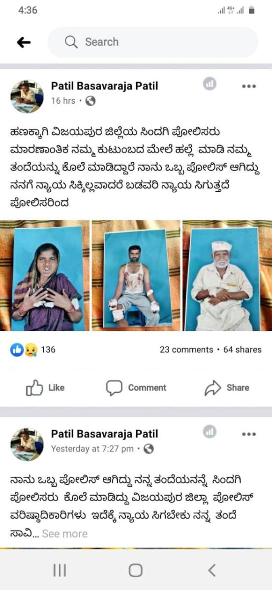 <p>A head constable attached to Yelahanka police station in Bengaluru and a native of Bantanur in Sindagi taluk of Vijayapura district has accused the Sindagi police of murdering his father for money.</p>.<p>A video clip in which Basavaraj Patil purportedly heard saying “Sindagi cops have killed my father Hanumantharaya for money in 2016. Being a policeman, I could not save my father...” The video clip has gone viral on social media platforms.</p>.<p>In the video, Basavaraj has urged the chief minister, Home minister and the Vijayapura SP to hand over the murder case to CBI.</p>.<p>“In his death note, my father has mentioned the names of eight policemen from Sindagi, blaming them for his death. Despite incriminating evidence and eyewitnesses, the SP has not taken any action against the cops in question,” he alleged speaking to <span class="italic">DH</span> on phone.</p>.<p>When asked whether your father was murdered or ended life since you talk about death note, the head constable said, “My father died due to the atrocities committed by the police. Only a thorough probe can bring out the truth.”</p>