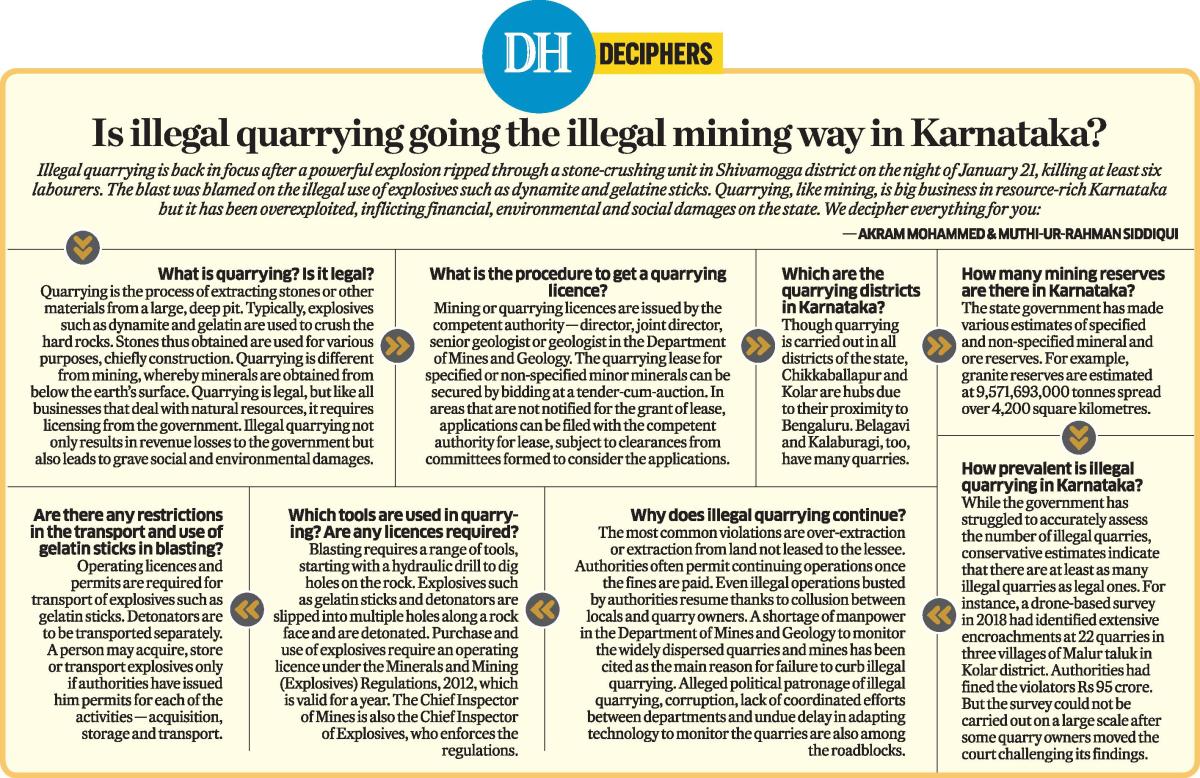 <p>Illegal quarrying is back in focus after a powerful explosion ripped through a stone-crushing unit in Shivamogga district on the night of January 21, killing at least six labourers. The blast was blamed on the illegal use of explosives such as dynamite and gelatine sticks.</p>.<p>Quarrying, like mining, is big business in resource-rich Karnataka but it has been overexploited, inflicting financial, environmental and social damages on the state. We decipher everything for you:</p>.<p><span></span></p>.<p><span></span></p>.<p><strong>What is quarrying? Is it legal?</strong></p>.<p>Quarrying is the process of extracting stones or other materials from a large, deep pit. Typically, explosives such as dynamite and gelatin are used to crush the hard rocks. Stones thus obtained are used for various purposes, chiefly construction. Quarrying is different from mining, whereby minerals are obtained from below the earth's surface. Quarrying is legal, but like all businesses that deal with natural resources, it requires licensing from the government. Illegal quarrying not only results in revenue losses to the government but also leads to grave social and environmental damages.</p>.<p><strong>What is the procedure to get a quarrying licence?</strong></p>.<p>Mining or quarrying licences are issued by the competent authority — director, joint director, senior geologist or geologist in the Department of Mines and Geology. The quarrying lease for specified or non-specified minor minerals can be secured by bidding at a tender-cum-auction. In areas that are not notified for the grant of lease, applications can be filed with the competent authority for lease, subject to clearances from committees formed to consider the applications.</p>.<p><strong>Which are the quarrying districts in Karnataka?</strong></p>.<p>Though quarrying is carried out in all districts of the state, Chikkaballapur and Kolar are hubs due to their proximity to Bengaluru. Belagavi and Kalaburagi, too, have many quarries.</p>.<p><strong>How many mining reserves are there in Karnataka?</strong></p>.<p>The state government has made various estimates of specified and non-specified mineral and ore reserves. For example, granite reserves are estimated at 9,571,693,000 tonnes spread over 4,200 square kilometres.</p>.<p><strong>How prevalent is illegal quarrying in Karnataka?</strong></p>.<p>While the government has struggled to accurately assess the number of illegal quarries, conservative estimates indicate that there are at least as many illegal quarries as legal ones. For instance, a drone-based survey in 2018 had identified extensive encroachments at 22 quarries in three villages of Malur taluk in Kolar district. Authorities had fined the violators Rs 95 crore. But the survey could not be carried out on a large scale after some quarry owners moved the court challenging its findings.</p>.<p><strong>Why does illegal quarrying continue?</strong></p>.<p>The most common violations are over-extraction or extraction from land not leased to the lessee. Authorities often permit continuing operations once the fines are paid. Even illegal operations busted by authorities resume thanks to collusion between locals and quarry owners. A shortage of manpower in the Department of Mines and Geology to monitor the widely dispersed quarries and mines has been cited as the main reason for failure to curb illegal quarrying. Alleged political patronage of illegal quarrying, corruption, lack of coordinated efforts between departments and undue delay in adapting technology to monitor the quarries are also among the roadblocks.</p>.<p><strong>Which tools are used in quarrying? Are any licences required?</strong></p>.<p>Blasting requires a range of tools, starting with a hydraulic drill to dig holes on the rock. Explosives such as gelatin sticks and detonators are slipped into multiple holes along a rock face and are detonated. Purchase and use of explosives require an operating licence under the Minerals and Mining (Explosives) Regulations, 2012, which is valid for a year. The Chief Inspector of Mines is also the Chief Inspector of Explosives, who enforces the regulations.</p>.<p><strong>Are there any restrictions in the transport and use of gelatin sticks in blasting?</strong></p>.<p>Operating licences and permits are required for transport of explosives such as gelatin sticks. Detonators are to be transported separately. A person may acquire, store or transport explosives only if authorities have issued him permits for each of the activities — acquisition, storage and transport.</p>