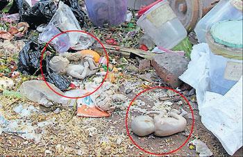 <p>These visuals will remain etched in the scattered memories of several residents of Shimoga. As many as 40 human foetuses were found among heaps of garbage in two different parts of the city on Friday morning.<br /><br /></p>.<p>Sources said nearly 20 foetuses were found in two sacks on Old Teerthahalli Road near Seethamma Ananthaiah community hall. Similarly, 20 to 25 foetuses were found in 20 plastic boxes in a drain opposite to Shankar Eye Hospital near Arakere on the outskirts of the city. <br /><br />It is suspected that these foetuses may have been thrown on Thursday night.<br />District Health and Family Welfare Officer Channabasappa said as many as 24 male and female foetuses were found. Some foetuses were found in plastic boxes containing labels. <br /><br />It is yet to be ascertained if the foetuses were stored in boxes for research purposes or for other reasons. <br /><br />The officer was hopeful that the forensic report will shed some light into it. Channabasappa added that the department would not hesitate to initiate action against the hospitals responsible for the dumping of foetuses.<br /><br />Superintendent of Police Raman Gupta visited the areas.</p>