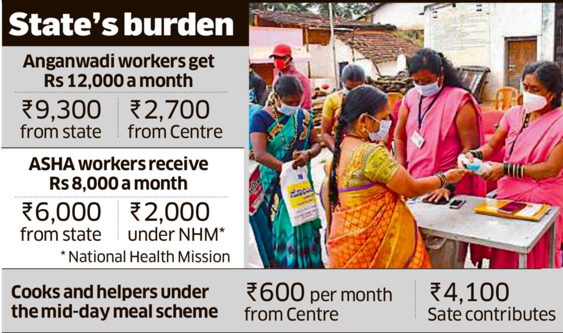 <p>Bengaluru: Karnataka is spending Rs 1,917 crore annually to provide additional financial assistance, or a top-up, to frontline workers because the Union government has not hiked its contribution to their honorariums for years, a finance department report has said.</p>.<p>This is adding to the “strain” in the Centre-state ties, according to the Medium Term Fiscal Plan (MTFP) 2026-30 report.</p>.<p>The state and the Union governments jointly pay honorariums to Accredited Social Health Activists (ASHA), Anganwadi workers and mid-day meal cooks.</p>.<p>“Central contributions towards these honorariums have remained unchanged for extended periods despite rising living costs and expanded responsibilities,” the MTFP said. “The lack of periodic revision of unit costs has led to a growing incidence of state having to increase funding for centrally-sponsored schemes through a state top-up, particularly in respect of honorariums and incentives for frontline workers,” it said.</p>.Rationalisation: Karnataka ASHA workers warn of stir from February 27 .<p>The state government pointed out that Anganwadi workers currently get Rs 12,000 per month. Of this, Rs 9,300 comes from the state and only Rs 2,700 from the Centre.</p>.<p>“ASHA workers receive Rs 8,000 per month, comprising Rs 2,000 under the National Health Mission and Rs 6,000 from the state. Similarly, cooks and helpers under the mid-day meal scheme receive Rs 600 per month from the Centre, while the state contributes Rs 4,100,” the MTFP said.</p>.<p>Karnataka, which is already confronting the Union government over the scrapping of MGNREGA, also complained about “the limited extent of Central cost-sharing in key pension schemes”. While the Centre supports 14.14 lakh beneficiaries in Karnataka under the National Social Assistance Programme (NSAP), the state government covers an additional 80.31 lakh beneficiaries under its own schemes.</p>.<p>“As a result, Central assistance reaches barely 15% of total beneficiaries in the state,” the MTFP said. In the current fiscal, Karnataka has spent an estimated Rs 10,668 crore on social security pensions of which the Centre’s share is just Rs 639 crore. </p>.<p>Karnataka has also flagged similar funding gaps in housing and food grain procurement. </p>.<p>“Delays and shortfalls in the release of Central funds under centrally-sponsored schemes have imposed significant cash-flow pressures on the state,” the MTFP said. “These structural pressures have reduced flexibility in resource allocation, constrained discretionary and developmental spending, and limited the pace of capital formation.”</p>.<p>Under the Jal Jeevan Mission, for example, Karnataka has had to pay even the Centre’s share to keep the programme going. So far, the state has released Rs 24,598 crore against the Centre’s Rs 11,787 crore. </p>