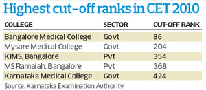 <p>As the seat selection process for general category candidates for the Common Entrance Test (CET) commences on Monday, the brightest among the students are once again expected to choose government medical colleges in the State over the private ones.<br /><br />Karnataka, which has the largest private medical education sector in the country, has shown a consistent trend in the last few years wherein seats in government colleges have been lapped up faster than those in private colleges.<br /><br />As per the cut-offs published by the Karnataka Examination Authority for 2010, Bangalore Medical College and Mysore Medical College -- both decades-old government colleges -- recorded the highest cut-off rank among all colleges offered through the CET. <br /><br />In the general category, Bangalore Medical College had the highest cut-off rank of 86, while Mysore Medical College, had the next best cut-off rank of 204. Government medical colleges at Hubli and Bellary also did well, with the Karnataka Medical College (Hubli) bagging the fifth highest cut-off rank( 424), and Vijaynagara Institute of Medical Sciences perched at the tenth position with a cut-off rank of 820. <br /><br />The reasons for the success of government medical colleges are not difficult to fathom; these colleges charge 40 per cent of the fee (Rs 16,700) charged by private ones (Rs 42,500). <br /><br />Even the six newer government medical colleges have fared better than several private colleges. These colleges, despite remaining under a cloud of doubt due to delays in approval from the Medical Council of India, have got brighter candidates than several private colleges<br /><br />The other important factor driving preference is location. Colleges based in Bangalore were the most popular, with four of the top five colleges ranked by cut-offs from the city. Besides BMC, the other colleges are Kempegowda Institute of Medical Sciences and MS Ramaiah Medical College. <br /><br />Dakshin Kannada is also a popular destination for medical education with two colleges from the Manipal group stable along with Father Muller Medical College being quite popular. <br /><br /><br /></p>
