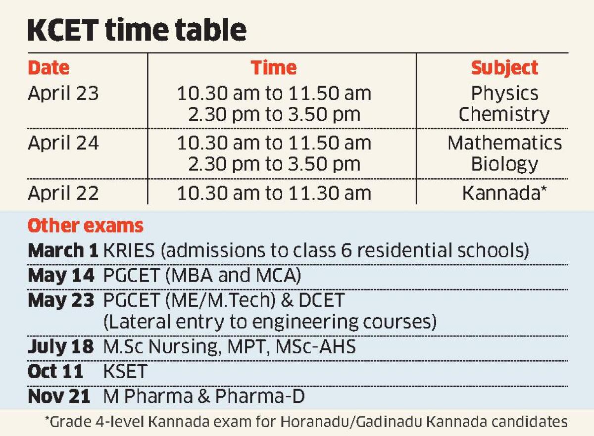 <p class="bodytext">The Karnataka Common Entrance Test (KCET) 2026 will be held on April 23 and 24. The online application submission process will begin from January 17. Kannada examination for Horanadu and Gadinadu Kannada candidates will be held on <br />April 22.</p>.<p class="bodytext">The Karnataka Examinations Authority (KEA) on Friday released the date sheet for the KCET 2026 and the authorities stated that this year the dates of all other examinations, including PGCET, DCET and KSET, have been released along with the KCET.</p>.<p class="bodytext">For the first time, the KEA has published a ‘CET Guide’, available both in Kannada and English, to help students to fill the application forms. “To help candidates to fill applications without errors, we have released a Guide and the same has been supplied to all pre university colleges, including those affiliated to other boards,” said Minister for Higher Education Dr M C Sudhakar.</p>.Karnataka govt may not adopt Centre's VB-G RAM G Act.<p class="bodytext">As explained by the minister, the CET Guide has complete and step-wise information on application filling and also complete information about the documents needed, verification process and seat allotment. This year, the KEA will open a Candidate Portal and candidates can download copies of application form, admission ticket, verification slip etc., by logging on to the portal.</p>.<p class="bodytext">Speaking about the decision to continue with the questions from the practical part of the PUC curriculum, Sudhakar said, “We have introduced practical-based questions in the KCET from 2025 and it will continue even for this year. This is basically to ensure that students concentrate even on practical classes.”</p>.<p class="bodytext">In the CET guide released, the KEA has even cautioned parents and students about the middlemen. In the guide, the KEA has stated, “In matters related to CET, neither candidates nor parents should trust any middlemen and get cheated. Because, you should know that the seat allotment is done only on merit, based on the seat matrix provided by the government.”</p>.<p class="bodytext">This year also it is OTP-based application filling and after the successful registration and login, candidates may proceed with entry of application details only after verifying the login plus OTP or live photo. The real candidate must provide his/her face identification at each subsequent <br />stage.</p>