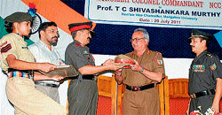 <p>The honorary rank was conferred on the Vice-Chancellor in recognition of his service in the field of academics, research, and higher education and promoting NCC in the affiliated colleges being a NCC cadet in his college days. <br /><br />Speaking on the occasion, NCC Group Commander Colonel Dinesh P Naikavde said this rank will enable the Vice-Chancellor to closely interact with NCC units, officers, and cadets in the university and guide them to uphold the ideals of the NCC.<br /><br />He said the schools and colleges organise 20 annual camps in a year in which 450 to 600 cadets take part. Many a times, university examination time table and NCC activities do not match. As a result, cadets having good potential are unable to attend the national-level camps. The best cadets must be encouraged so that they will bring laurels to the region. <br /><br />After receiving the honour, Mangalore University Vice-Chancellor Prof T C Shivashankaramurthy said “NCC trains youth to be disciplined citizens of the country. Till 1970s, NCC cadets were given rigorous training. In fact, NCC cadets were second line of defence during India’s war with Pakistan. <br /><br />The cadets were transporting weapons to the warfield and helping the soliders. After 1973, the syllabus was modified and gave emphasis to discipline. The NCC helps in developing quality of character, courage, leadership, spirit of adventure. We need leadership with integrity and sincerity. The NCC helps in developing the personality of a child.” <br /><br />“I know the significance and honour associated with the rank and the uniform, because I was an NCC cadet myself,” he said. <br /><br />He promised support to all NCC activities, and said that he would shoulder the responsibility of promoting the NCC in the institution affiliated to the university.<br /><br />“We should motivate the students to take up career in armed forces. As many as 5,000 colleges and 7,000 schools have NCC units in the country. The number of NCC cadets is 14 lakh, which is largest contingent of youth organisation in the whole world,” he informed. <br /><br />In the visitors book, Prof T C Shivashankaramurthy wrote: “It was very impressive function and guard of honour. The cadets looked smart. I assure all cooperation from the university.” <br /><br />Seven VCs get honour<br /><br />Of the 504 universities, seven Vice-Chancellors in the country were selected for the honorary rank of Colonel Commandant of NCC for 2010-11. They are Dr Govinda Prasad Mishra of New Vaterinary University, Jabalpur; Dr S C Sharma of Tumkur University; Prof Mohammed Iqbal Ali of Satavahana University, Karimnagar; Dr Navin Mathur of Jai Narayana V K University, Jodhpur; Dr K Meena of Bharathidasan University and Prof T C Shivashankaramurthy of Mangalore University. <br /><br />In Mangalore University, Prof T C Shivashankaramurthy is the third Vice-Chancellor to get the honour. The other VCs who recieved the honour are Prof Kaveriappa and Prof Hanumaiah. <br /><br />NCC gets credit<br /><br />Mangalore University Vice-Chancellor Prof T C Shivashankaramurthy said that NCC cadets will get eight credits in the semester system. Each semester will have 50 marks which is equivalent to two credits. There are 26 departments with 37 post graduation courses in the Mangalore University. One seat is reserved for NCC cadet in each course. <br /><br />Mangalore University Registrar Prof Chinnappa Gowda and Commanding Officer Lt Col Alok Parmar were present. <br /></p>