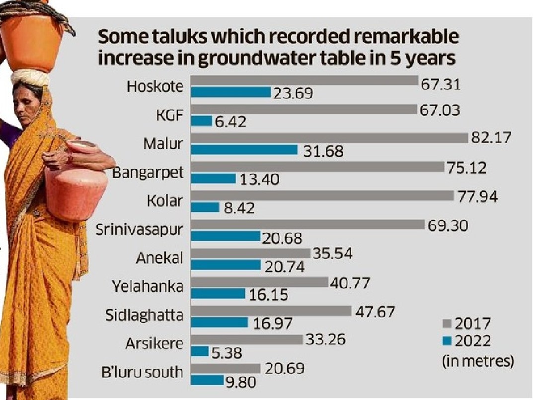 <p>Heavy rainfall and floods may have led to huge crop loss this monsoon but there is reason to cheer as groundwater levels in the state, even in arid districts like Kalaburagi, have risen sharply. There is a steep rise in the water table in 211 out of the 233 taluks in the state, according to Ground Water Directorate data from May to Nov 2022.</p>.<p>The groundwater level in Nelamangala in Bengaluru rural district has witnessed a record increase of 32.44 m. Water is now available at 17.94 m while in May it was 50.38 m. As many as 24 taluks including Hoskote, Devanahalli, Gauribidanur, Chikkaballapur, Malur, Jamkhandi and Badami have recorded at least a 10-m rise in the groundwater table. Groundwater is now available at a depth of 10 m in 186 taluks. A mere 94 taluks had this level at the start of the monsoon.</p>.<p><strong>Read | <a href="https://www.deccanherald.com/state/groundwater-extraction-has-risen-in-karnataka-in-2022-report-1164578.html" target="_blank">Groundwater extraction has risen in Karnataka in 2022: report</a></strong></p>.<p>“Pre- and post-monsoon data through 10 observation borewells in every taluk shows a remarkable increase in levels due to heavy rain. The irrigation department has taken up water harvesting schemes like check dams, percolation tanks, borewell recharge pits,” says Ground Water Department director Ramachandraiah.</p>.<p>Even in Ballari, Vijayanagar, Davangere, Kalaburagi, Raichur and Yadgir districts, groundwater level is available at a depth of 5 m.</p>.<p>“Most of the 20 borewells in our village were defunct 3-4 years ago. Now, all borewells are working and the lake has reached its brim due to abundant rainfall,” says farmer Mallikarjun Avanti of Kodli village in Sedam taluk.</p>.<p>Officials claim that lake revival projects have also impacted groundwater positively. “The government has launched a project of filling 4,500 big lakes out of around 33,000 lakes. Abundant rainfall during the last two years has helped the project,” an officer said.</p>.<p>Overflowing rivers have also contributed to the rise in groundwater levels.</p>.<p>On the contrary, 22 taluks have recorded a marginal drop in groundwater levels of about 3 m. Nagamangala taluk in Mandya district has recorded the highest drop by 25.11 m. Gangavathi in Koppal district has witnessed a fall in water levels by 10 m. Experts attribute this to evaporation. They emphasise the need to actively work on conservation activities. If indiscriminate drilling for borewells continues, 80% of the water table will be affected.</p>.<p>“Karnataka has received three times more rainfall than the average during the last two years. Water evaporation due to sunlight and wind can be reduced if vegetation is improved. Micro-climate conditions should be created and afforestation needs to be taken up,” says hydrogeologist and rainwater harvesting specialist Devaraj Reddy N J.</p>